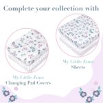 My Little Zone changing pad sheets have holes for the safety straps. Smooth for baby’s skin, machine washable and made to last with cotton that will stay just as bright and soft after each wash