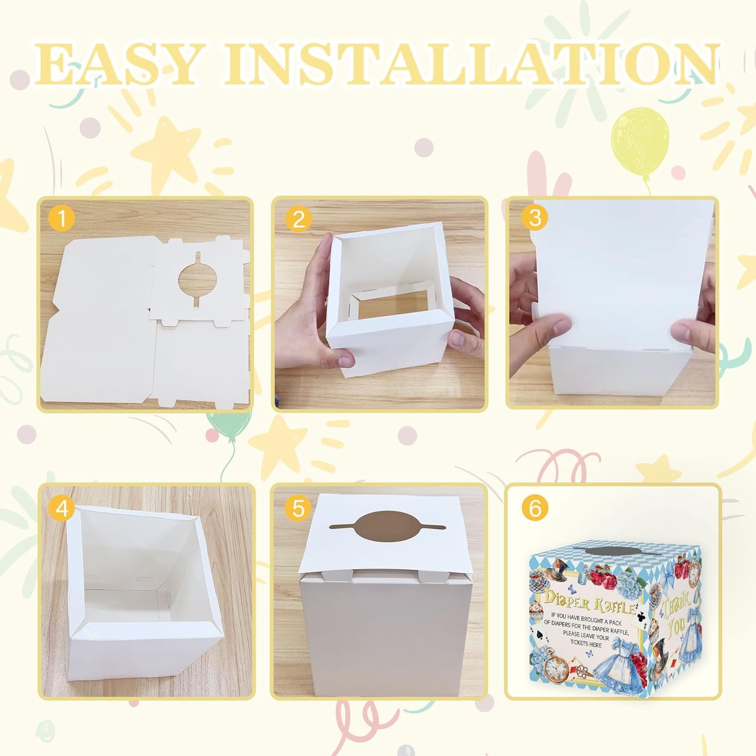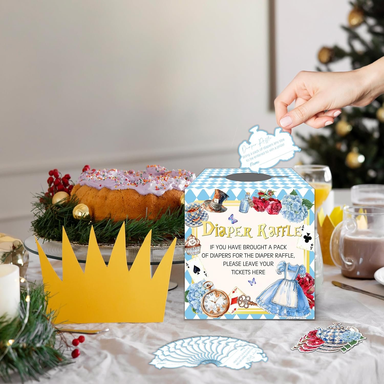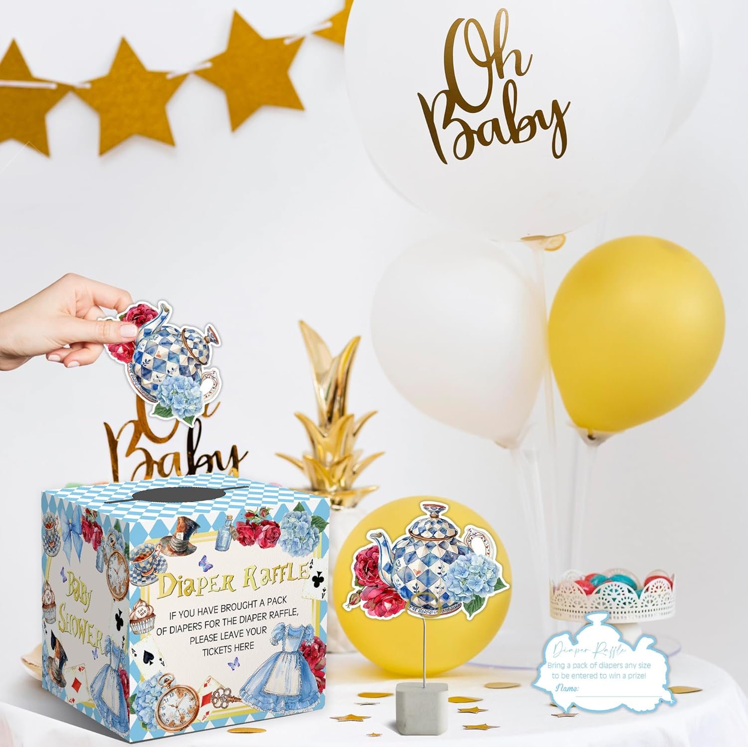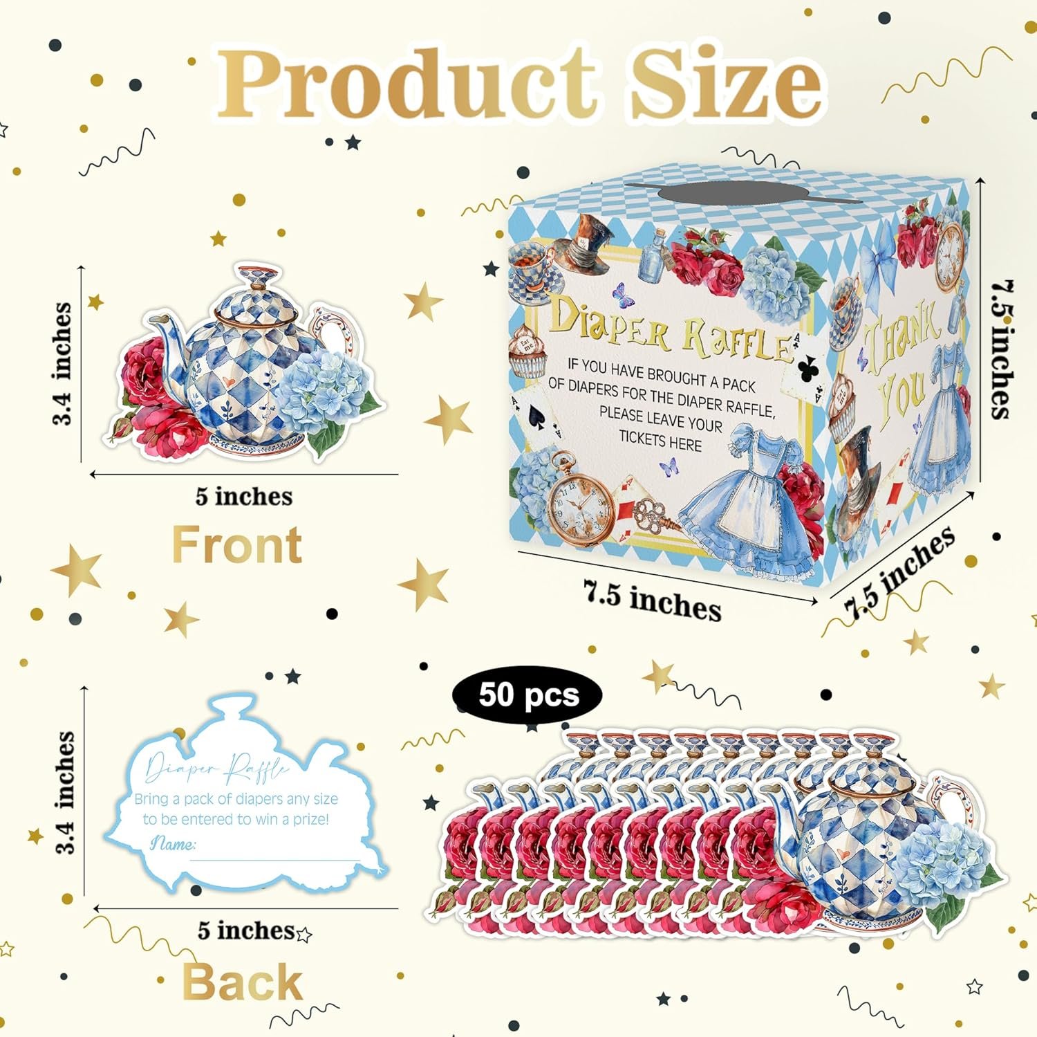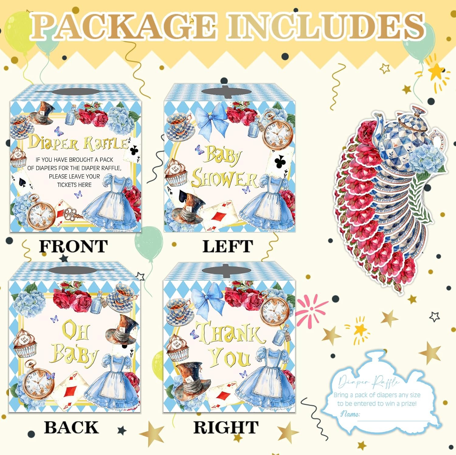 Complete Wonderland Diaper Raffle Game: This set includes everything you need to host a fun and engaging diaper raffle at your baby shower. It includes a 7.5″ x 7.5″ x 7.5″ raffle box, 50 Wonderland themed raffle tickets (5″ x 3.4″) perfect for any baby shower or gender reveal even.