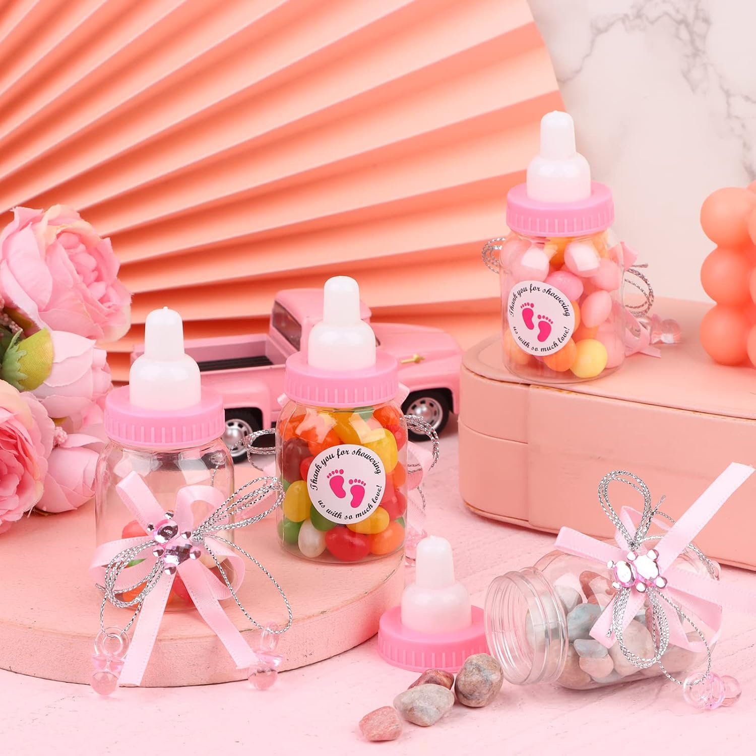 62 Pcs 3.5 Inch Baby Mini Milk Bottle Baby Shower Favor with 500 Adhesive Thank You for Showering Stickers, Small Plastic Bear Candy Bottle for Boy Girl Newborn Baptism Party Decor (Pink)
