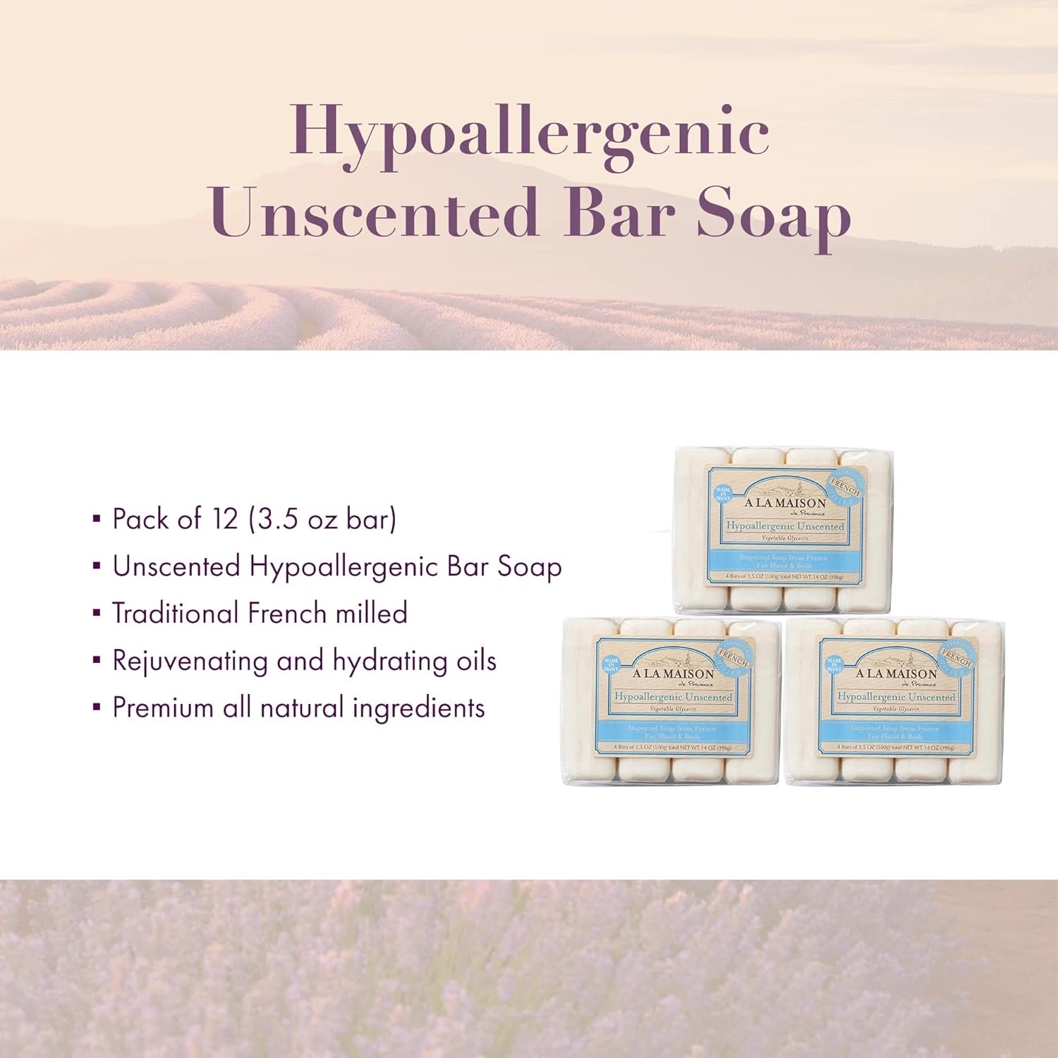 A LA MAISON Hypoallergenic Unscented Bar Soap – Triple French Milled Natural Moisturizing Hand Soap Bar (12 Bars of Soap, 3.5 oz)
