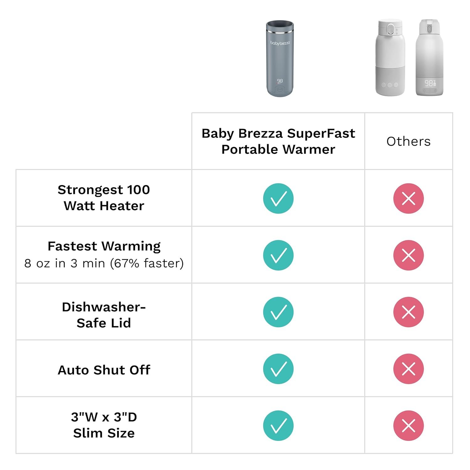 The Baby Brezza SuperFast Portable Bottle Warmer is the fastest, most advanced way to warm breastmilk, formula, water or a filled milk storage bag on the go. Now available in bold Black color. It’s clinically proven to warm up to 67% faster than other portable warmers, including 8 oz in 3 minutes (from room temp to 98°F). Its Advanced Sensor Technology safely and evenly warms breastmilk and formula from top to bottom, protecting nutrients. No more adapters, leaks or turning bottles upside down! This rechargeable travel warmer warms up to eight 6 oz bottles (from room temp to 98°F) on a single charge, and it easily fits in cupholders or bottle pockets in diaper bags and backpacks, cars and strollers. The interior stainless-steel cup holds 9 oz of liquid or a filled 6 oz milk storage bag, and the dishwasher safe lid features a 360° pour spout. Choose from 4 warming temperatures: 80°F, 98°F, 99°F, or 103°F. Includes USB-A charging cable; Power adapter not included; 1 year limited warranty (not valid if shipped or used outside the US).