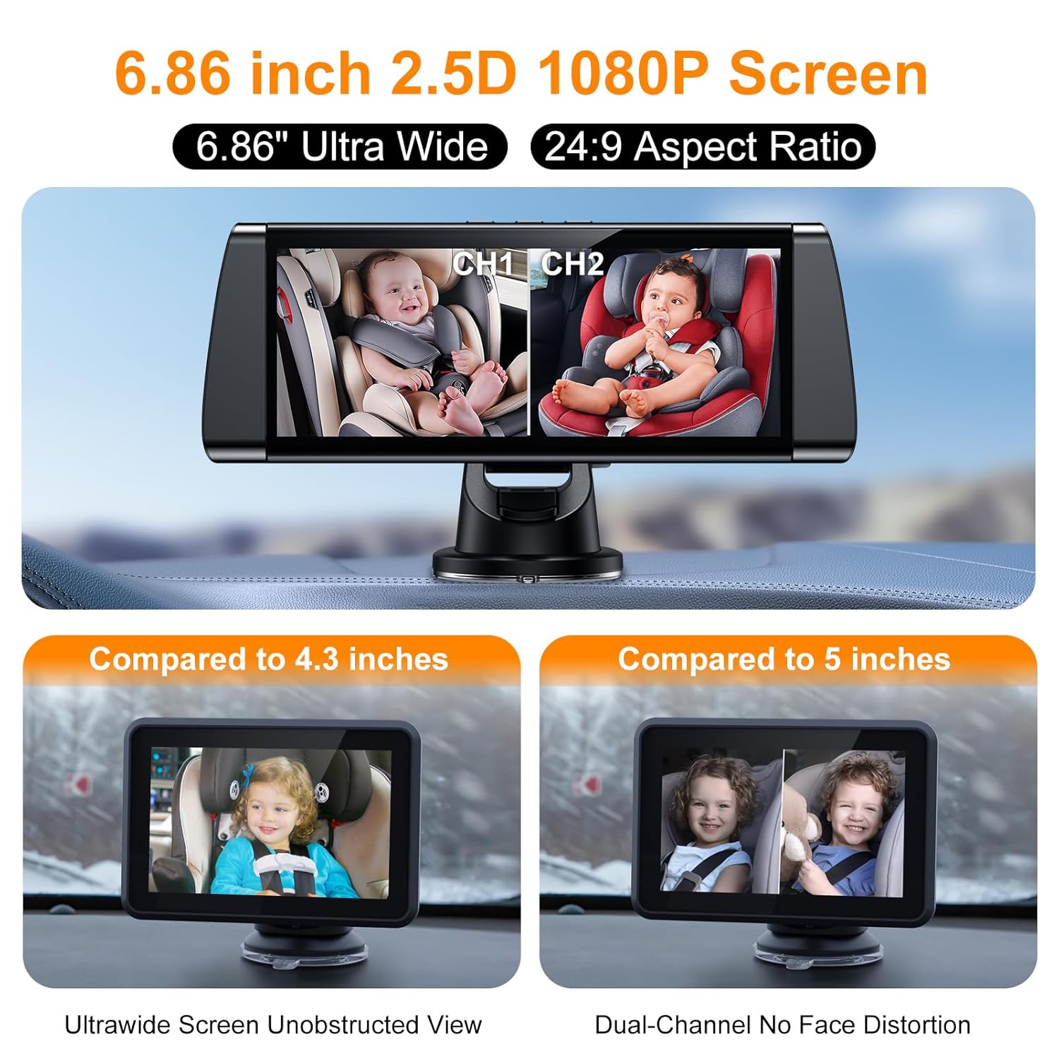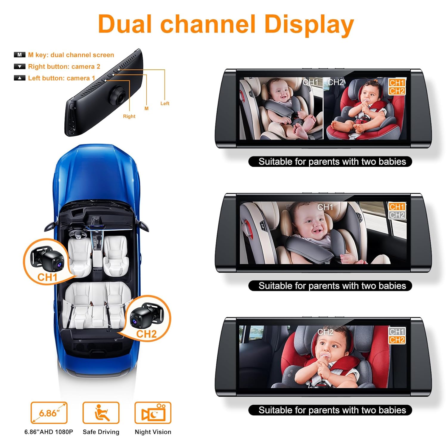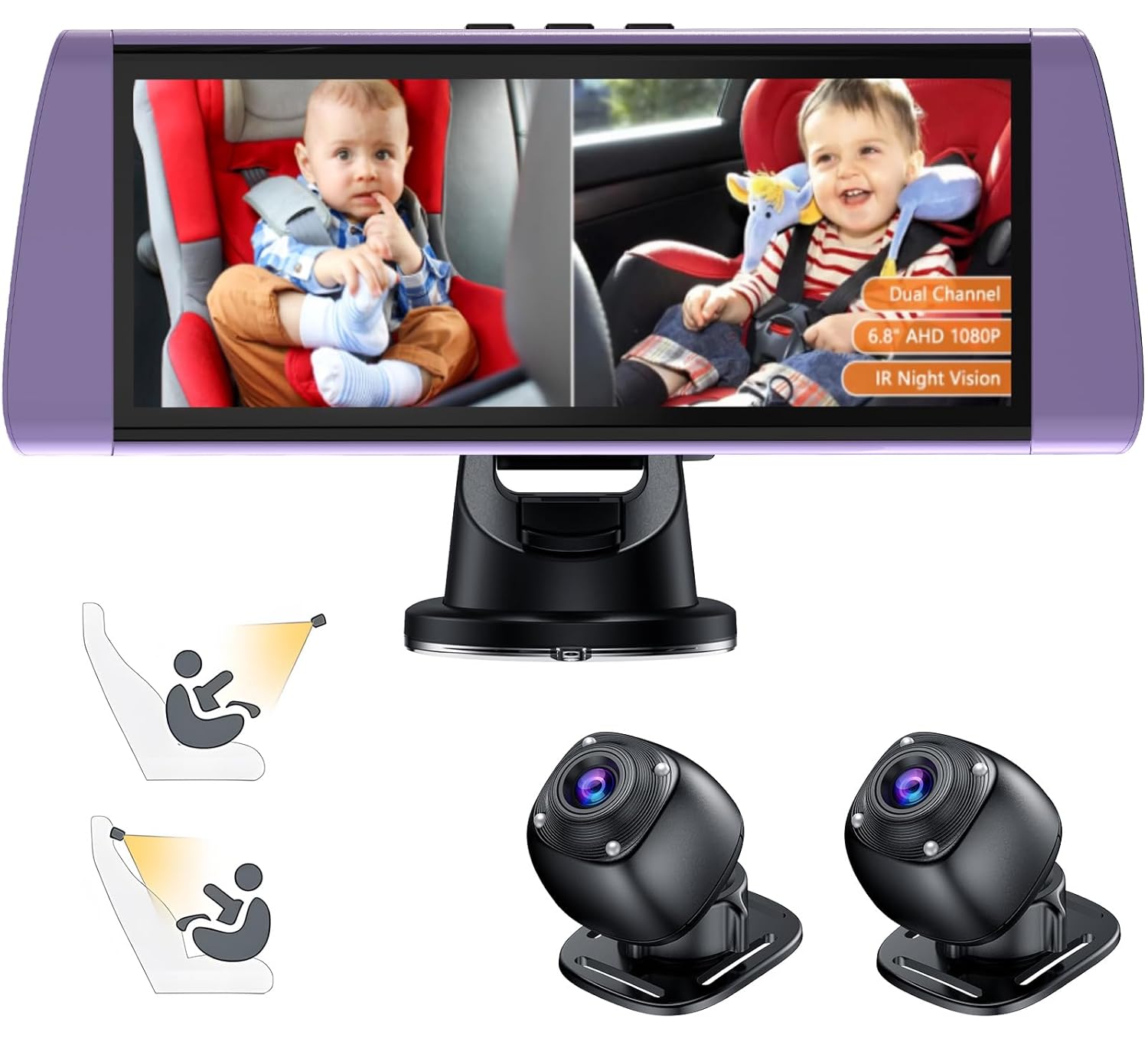 Baby Car Camera, Dual Channel 6.86 inch Display with 2 IR Night Vision Camera, Night Vision, Wide Clear View, Easily Observe The Baby’s Move, Safe Driving for New Parents (Purple)