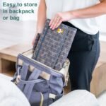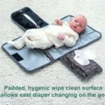 This is the only diaper mat you’ll need for their first year of life, and maybe even into their second, because it gives you 23.5 x 13.5” of space when opened out, with a 7” wide memory foam pillow to nestle baby’s head. It’s designed to fit into any diaper bag and folds up to a compact 13.8 x 8.4”. And the thickness will be determined by the number of wipes and diapers you store inside the 10×6” pockets.
