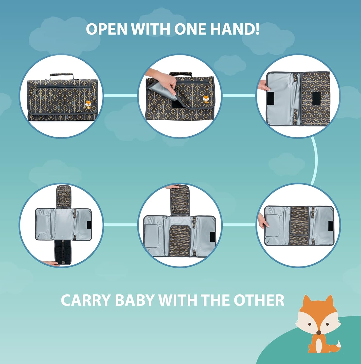 It’s hard enough to hold our wiggly lil cubs with two hands, let alone holding them while also struggling with diapers, wipes and creams. But now, you can forget about change pads with tricky plastic clips and hard to access pockets because the Lil Fox Portable Change Pad was created for a quick and nimble change! In fact, it’s the ONLY diaper pad that works with one hand, with everything you need on hand!