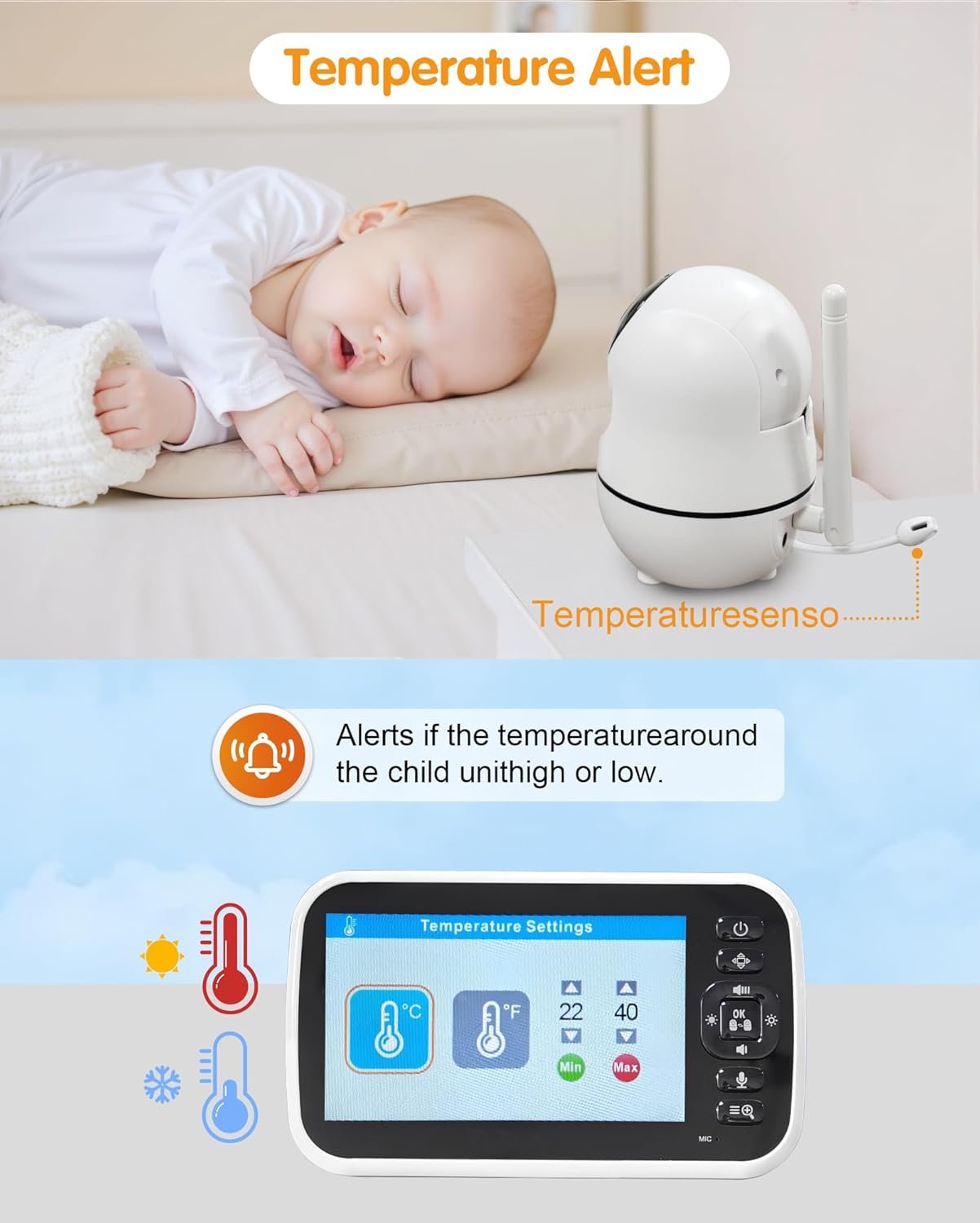 No WiFi Required, 1000ft Range, & Temperature Monitoring: The baby monitor operates without WiFi, ensuring enhanced privacy and security for your family. With a 1000ft wireless range, it covers large homes and different rooms. Plus, it monitors your baby’s room temperature and sends an alert if the temperature exceeds the set threshold, keeping your baby comfortable at all times.