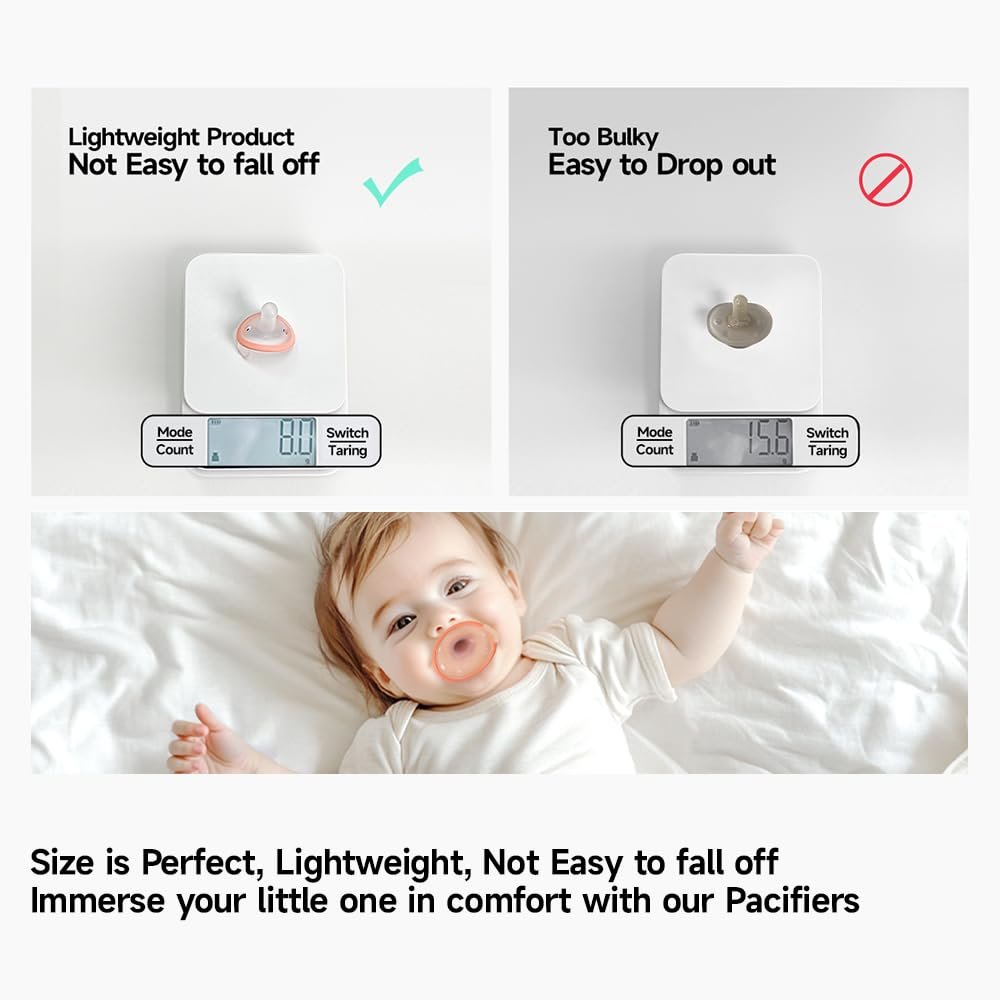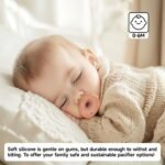 NIPPLE SHAPE PACIFIERS: Our baby pacifier allows your child to self-soothe by exercising their instinctive sucking instinct in the most natural way possible, by mimicking both the shape and soft materials of mothers’ breast. The classic pacifiers appearance, comfortable feel for baby with textured silicone nipple that’s designed to mimic the feel of moms breast.