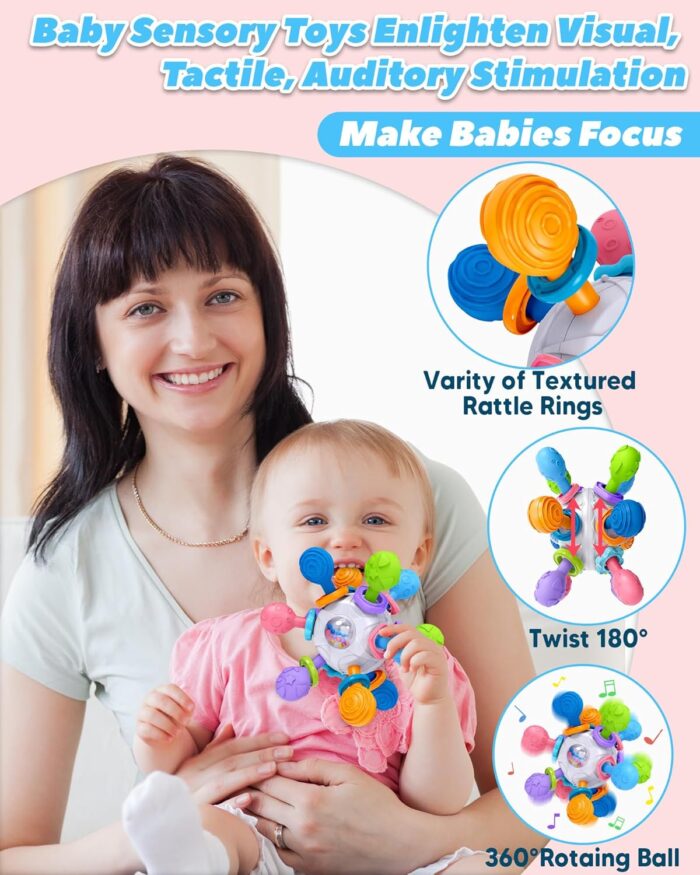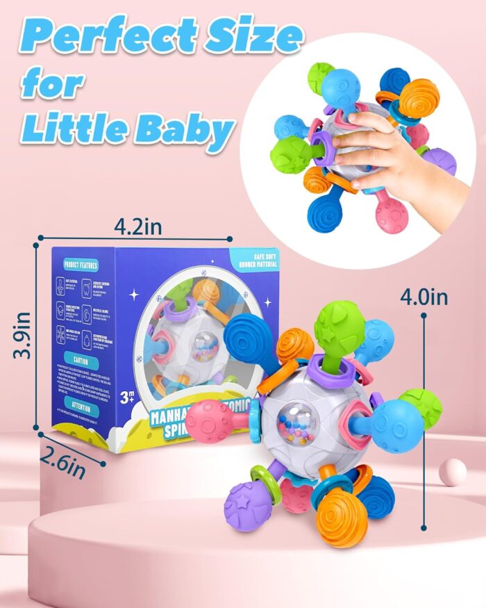 Baby Multi-Sensory Teething Toys: Tonberless hand-held baby teething toys, the baby will have the habit of biting or crying, eating hands. The 360-degree rotary teething ball has 12 chew points and different textured surfaces. Massage the gums to relieve teething pain more effectively and meet the needs of the baby’s oral stage. Different textures provide a stimulating touch and help the baby’s sensory development.