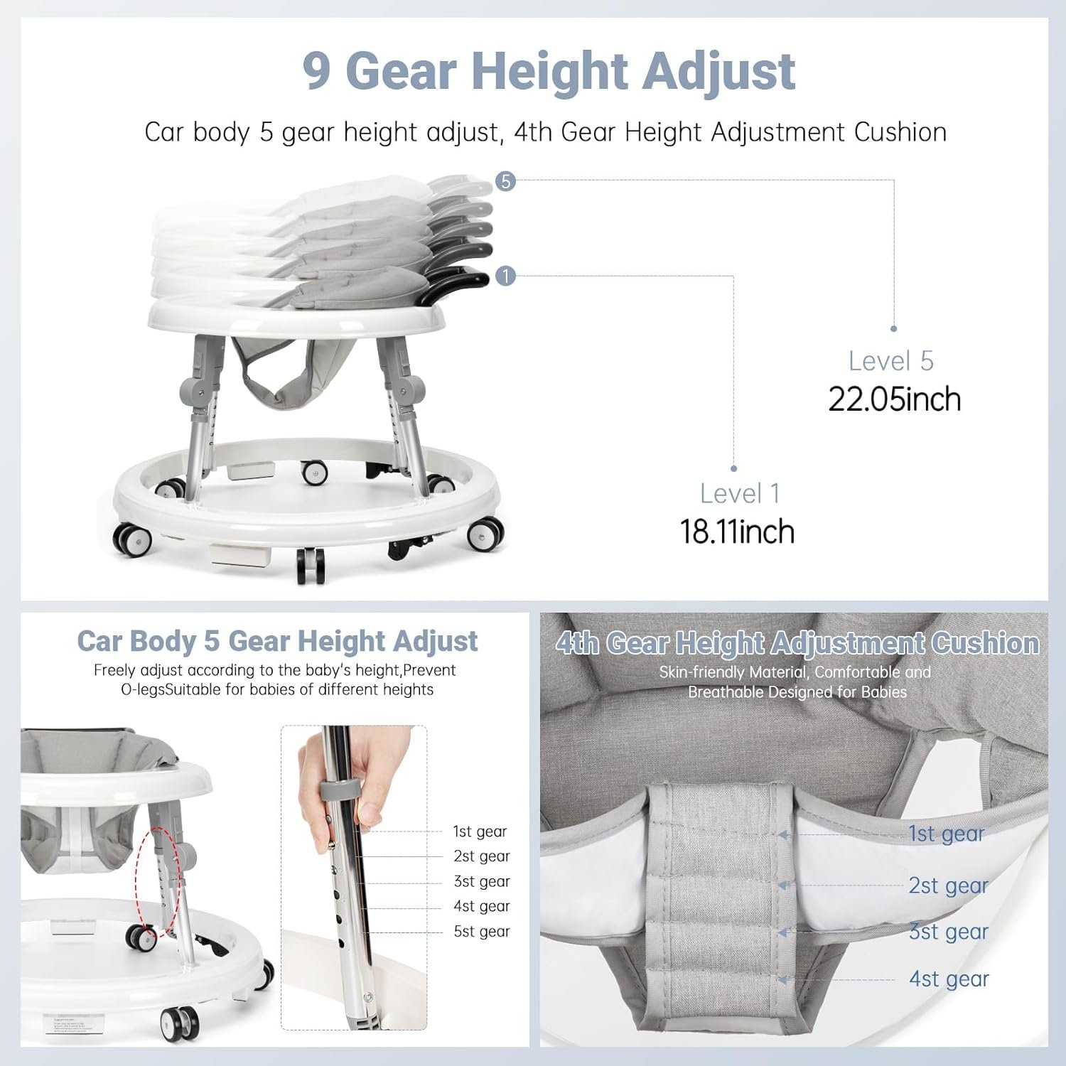 [9 gear height adjustment]: Our baby walkers for boys and girls have 9 gear adjustment modes, including 5 gear adjustment for the body and 4 gear adjustment for the seat. Adjustable body height: 15.75 inch to 18.5inch. Adjustable seat cushions can provide your baby with extra support and a comfortable tilt. You are free to adjust the appropriate height according to your baby’s height to prevent O-legs.