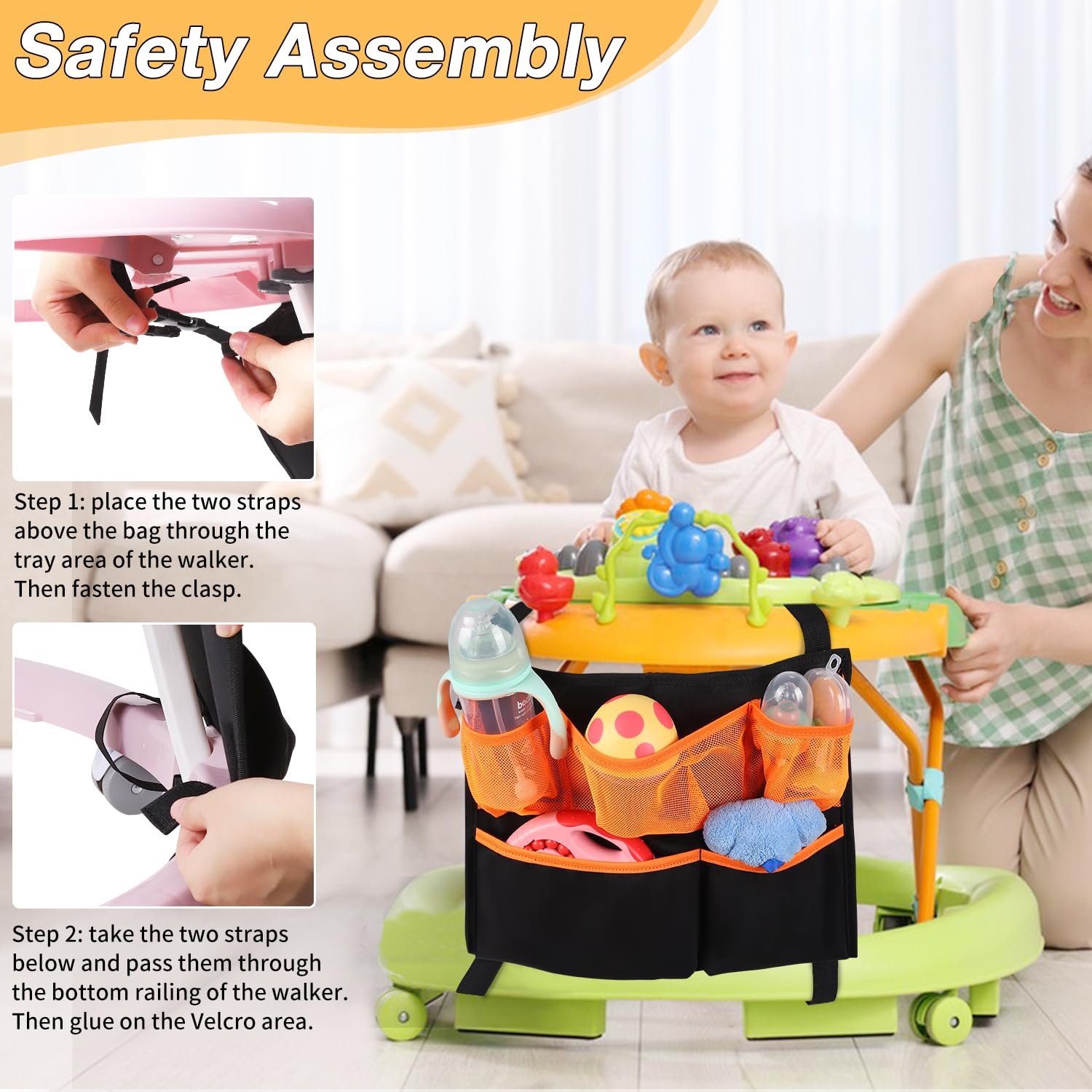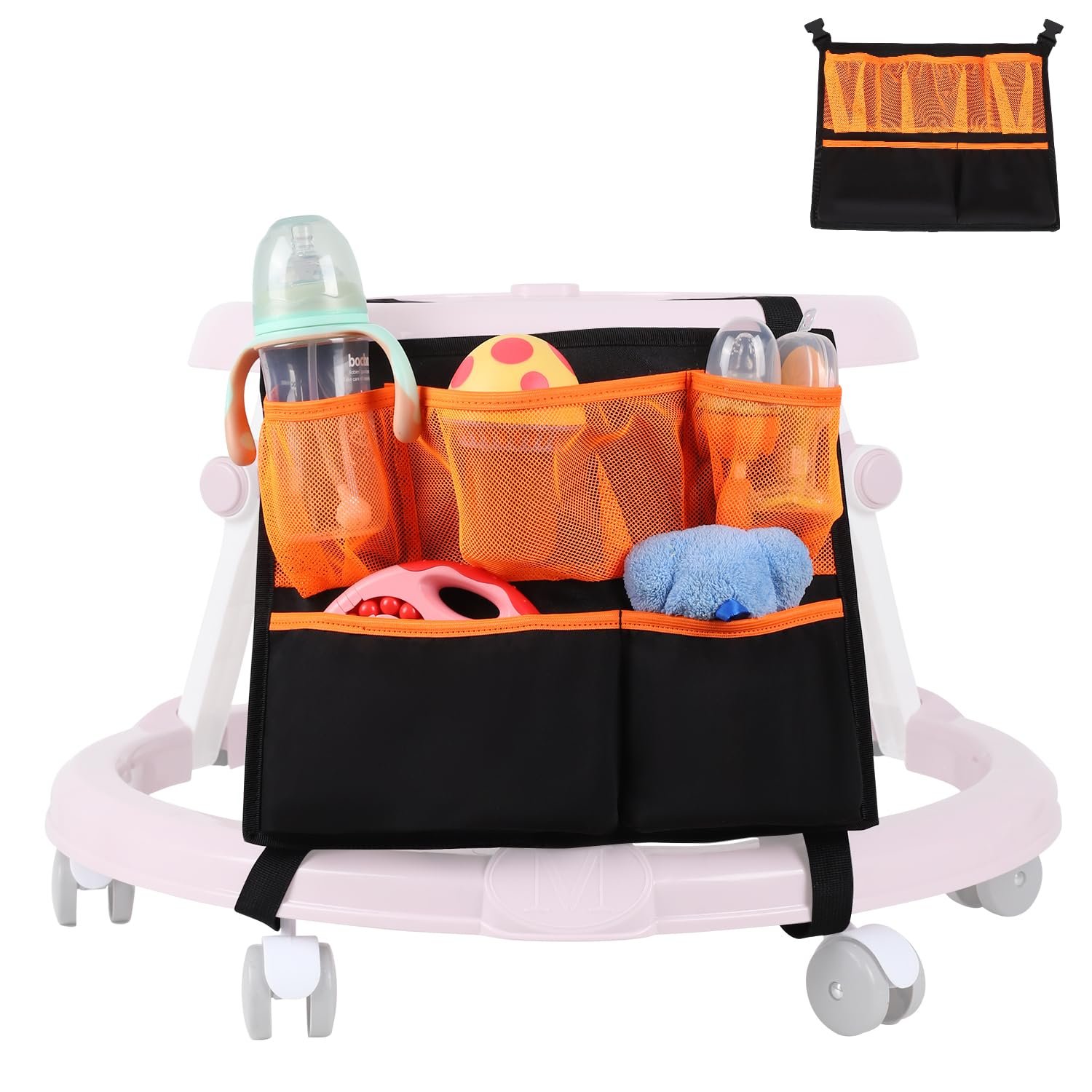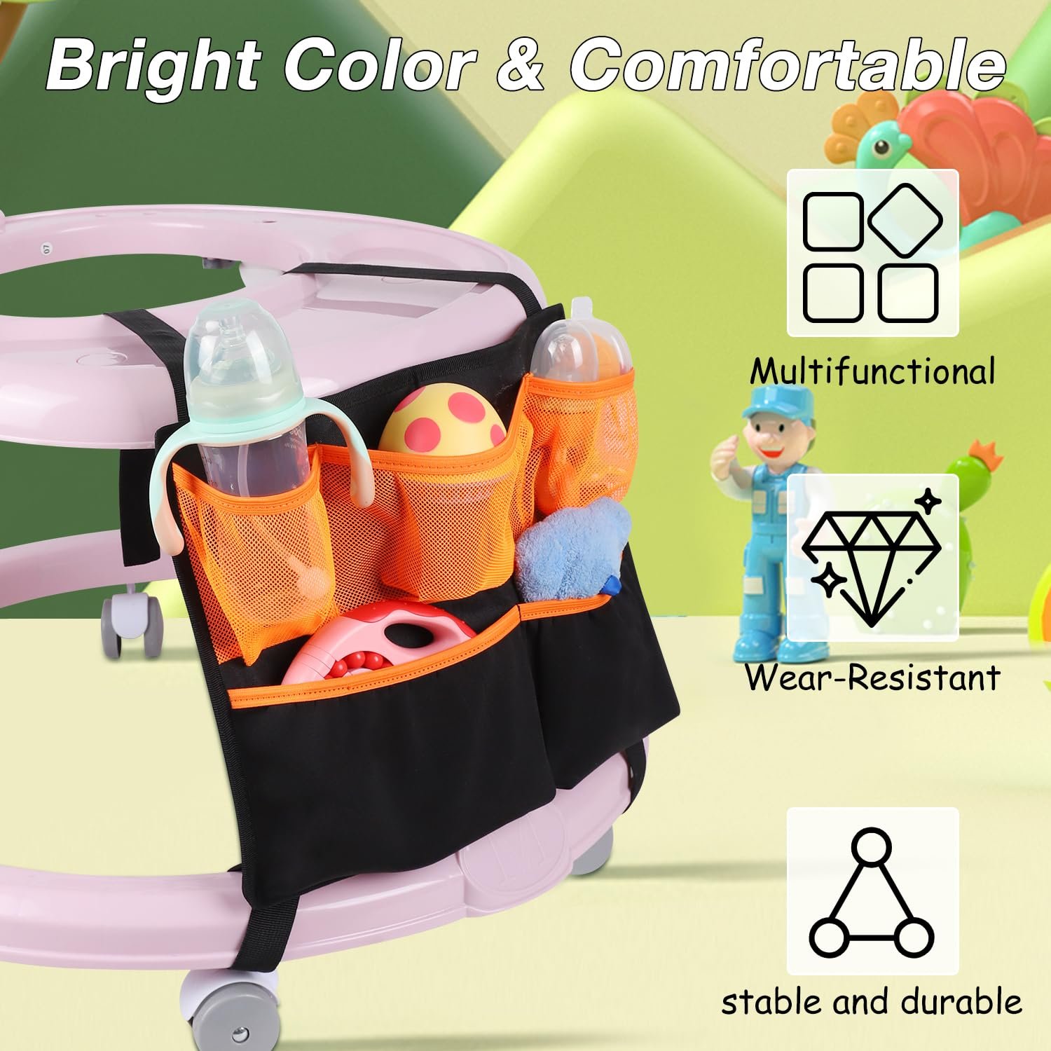 Versatile Use: Designed for practicality, the baby walker organizer is a must-have accessory for conveniently carrying and storing your belongings while playing at home or on the go.