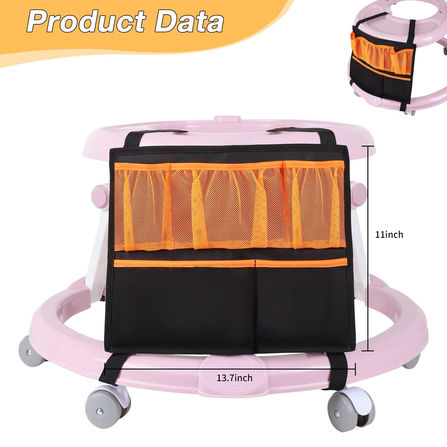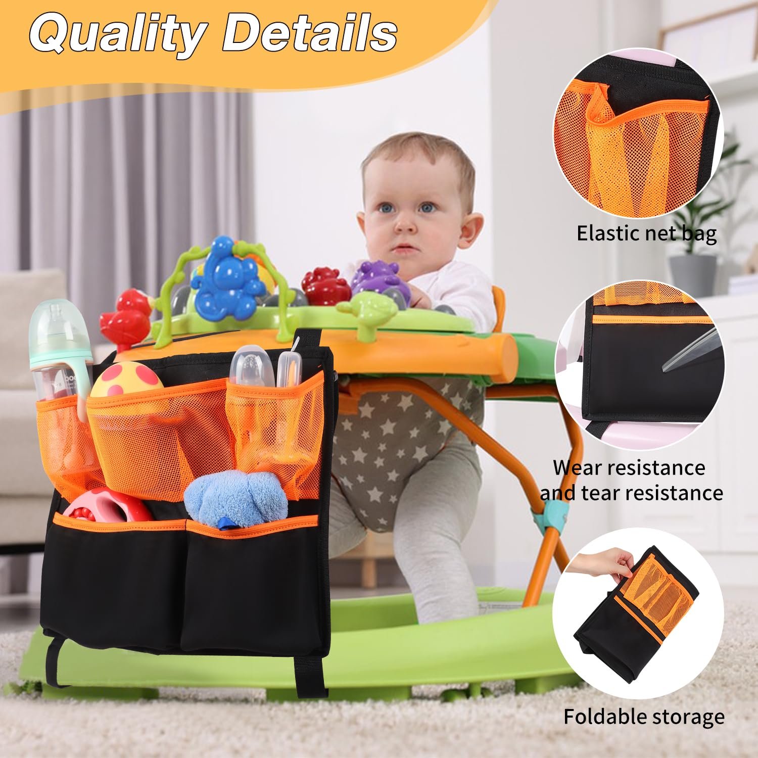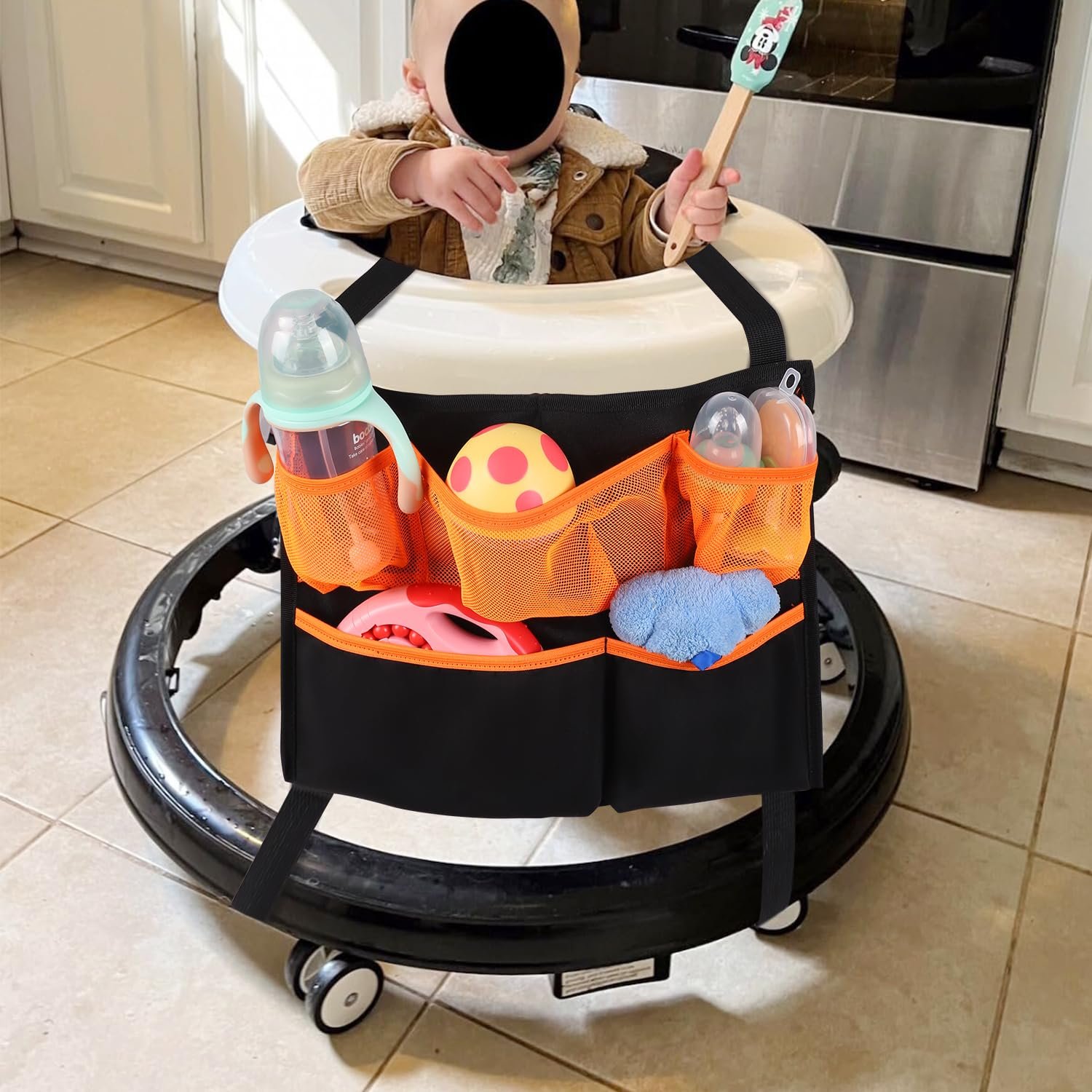 Versatile Use: Designed for practicality, the baby walker organizer is a must-have accessory for conveniently carrying and storing your belongings while playing at home or on the go.