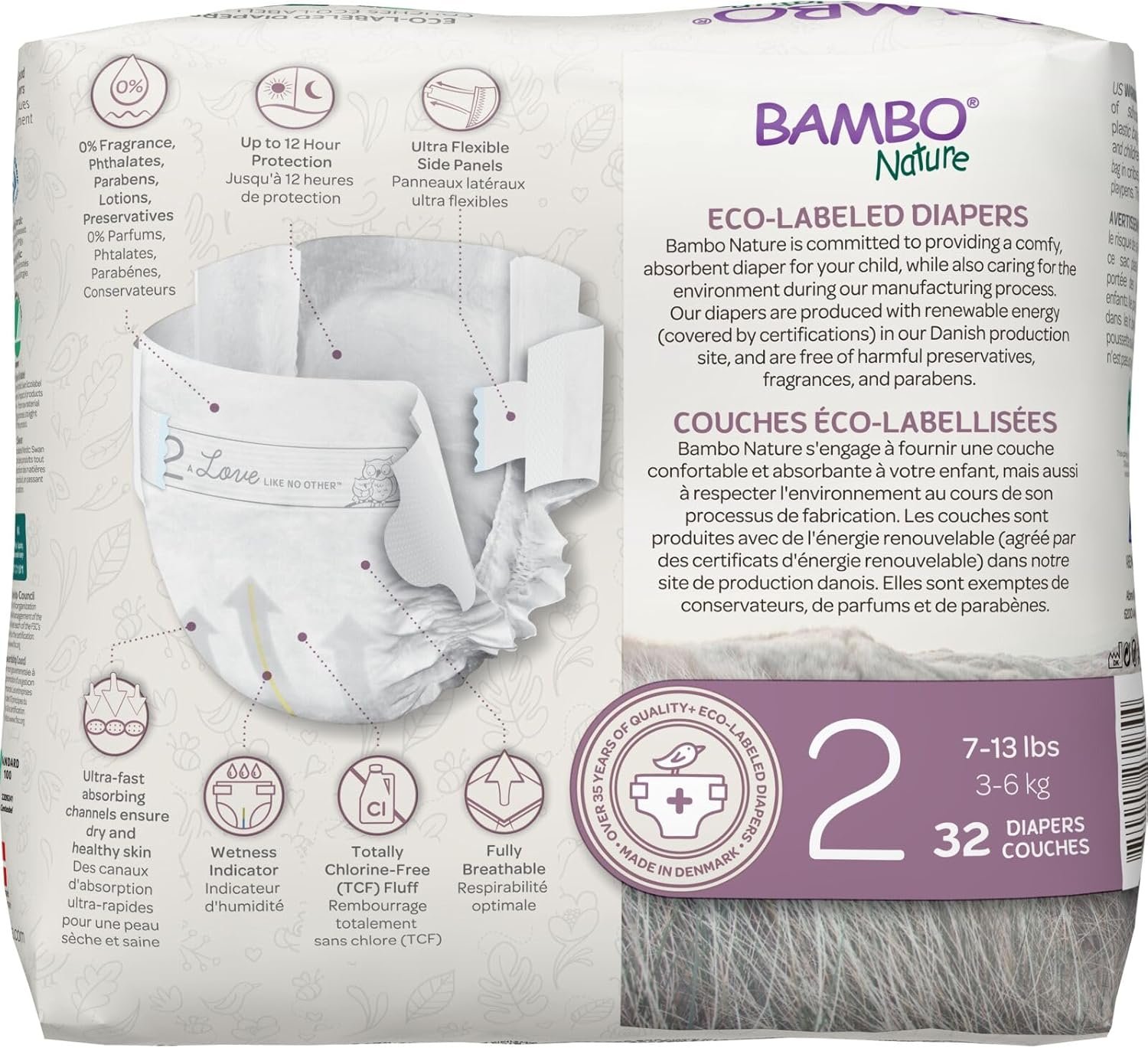 Bambo Nature Hypoallergenic Baby Diapers, Eco-Labelled Sustainable Diapers, Enhanced Leakage Protection, Totally Chlorine-free, Skin Friendly, and Super Absorbent – Size 2 (32 Count)