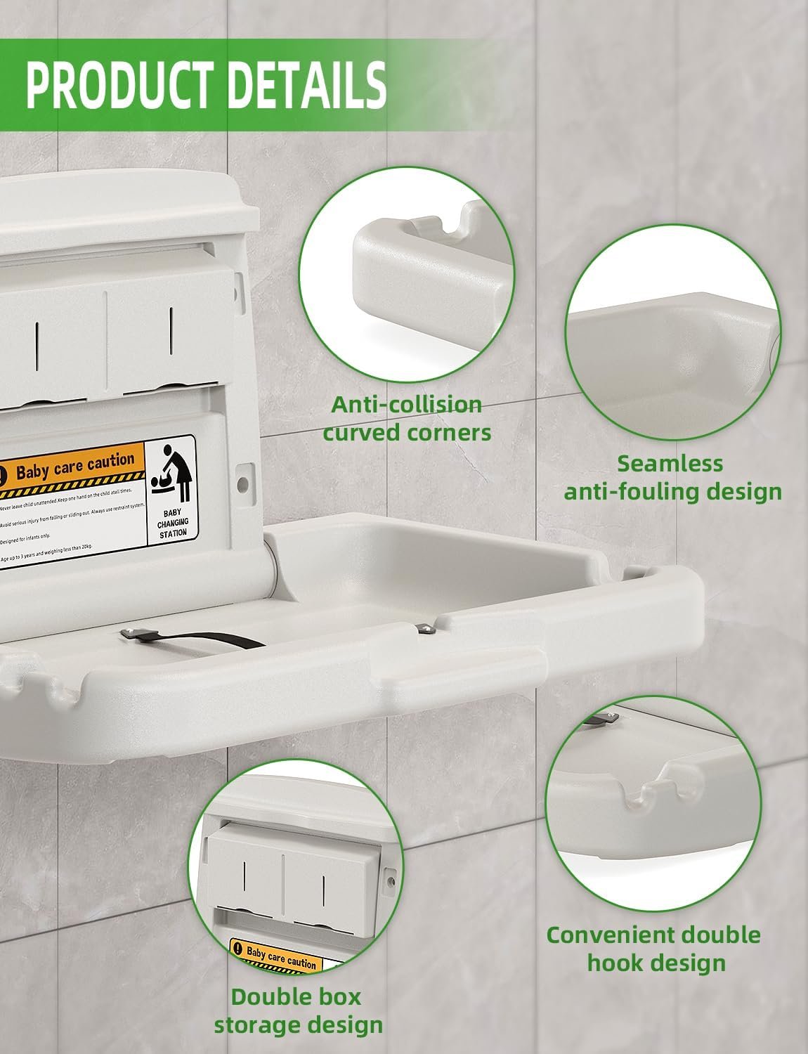 HDPE MATERIAL: Made of hygienic and easy-to-clean HDPE, this diaper changing station can be cleaned with a wipe, providing a safe and hygienic surface for every use, reducing the risk of sanitary problems.