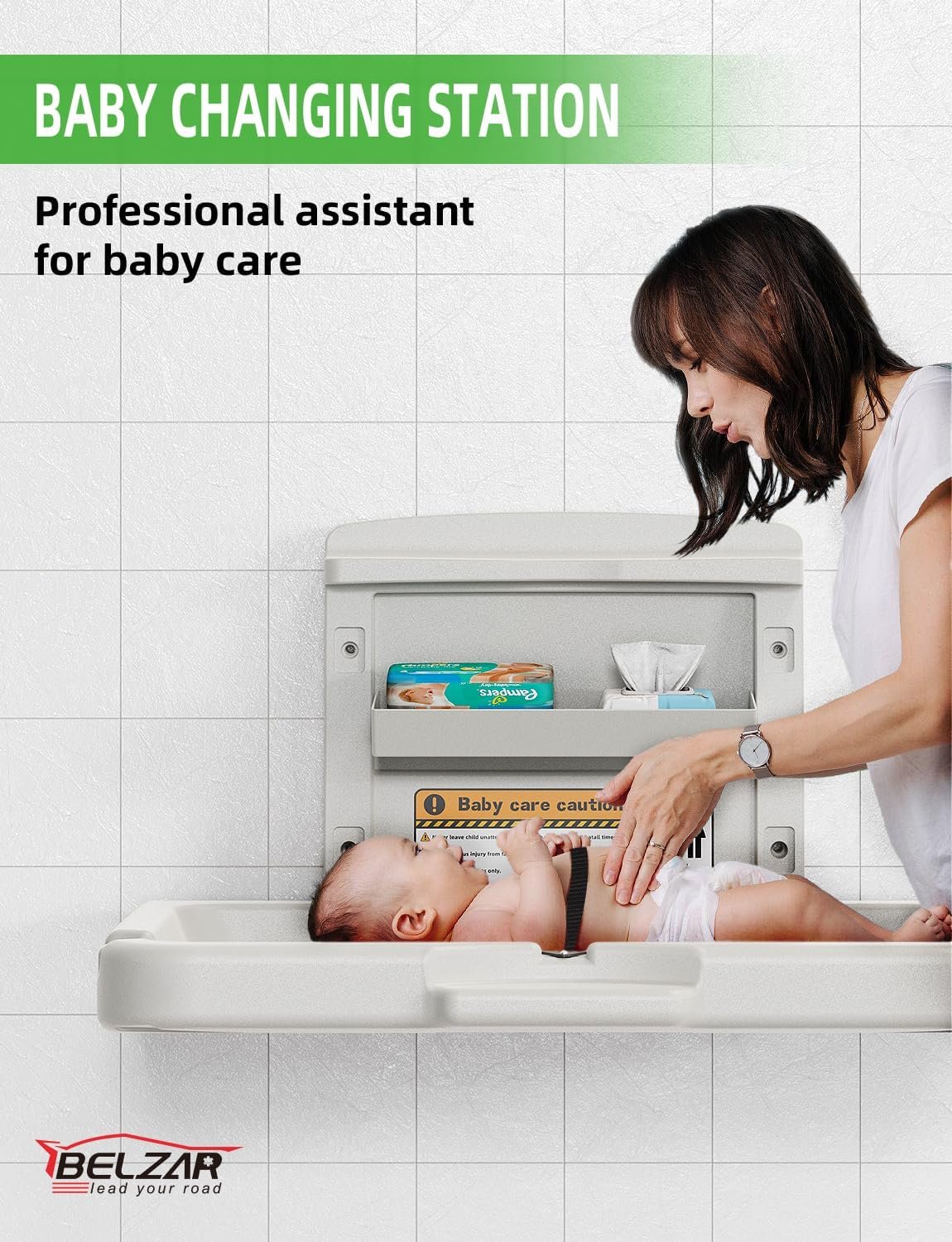 BELZAR Commercial Wall Mounted Baby Changing Station – Foldable Wall Mounted Changing Table with Safety Strap Paper Holder for Commercial Bathrooms, ADA Complaint White Gray