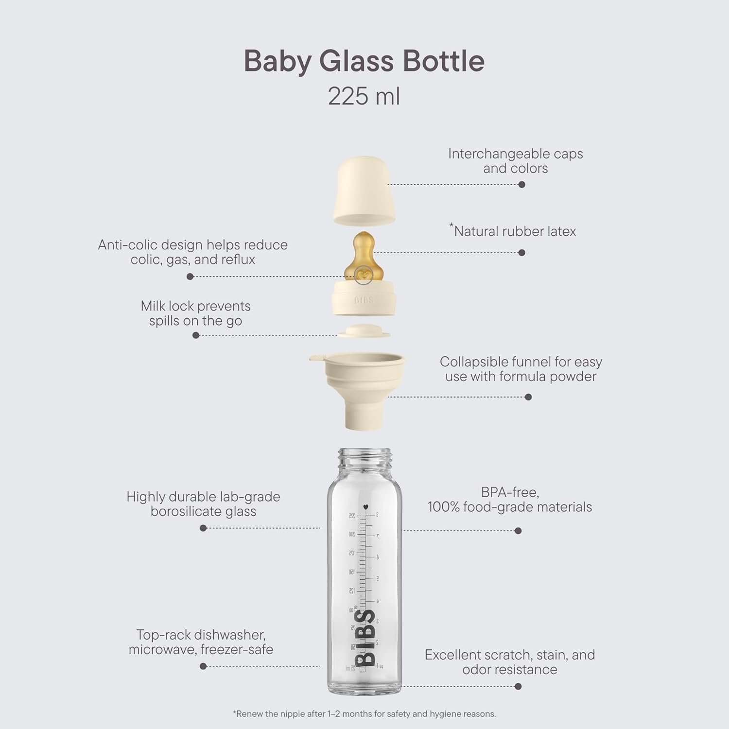 BIBS Baby Glass Bottle. Anti-Colic. Round Natural Rubber Latex Nipple. Supports Natural Breastfeeding, Complete Set – 225 ml, Baby Blue