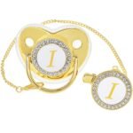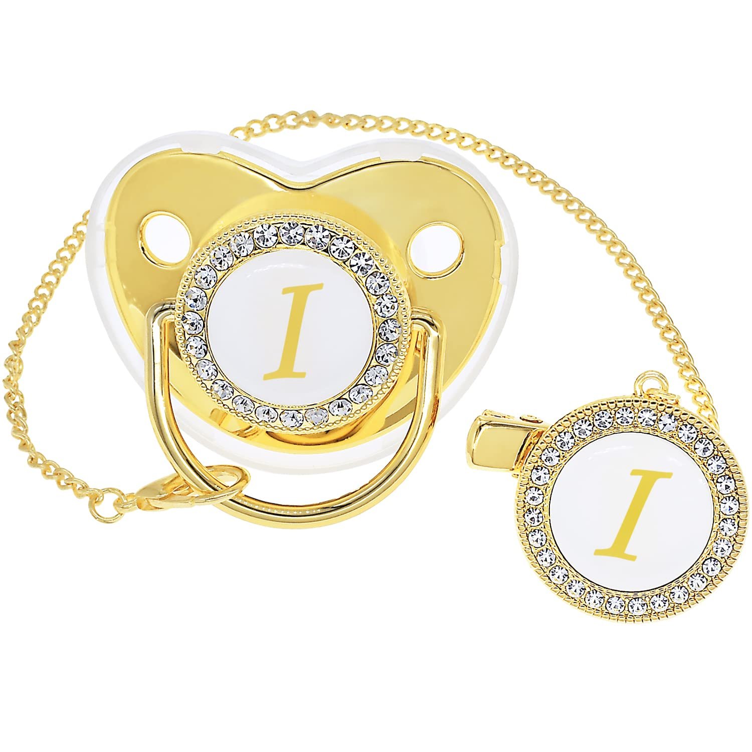 Bling Personalized Golden Baby Pacifier with Pacifier Clips and Anti-dust Cover A-Z 26 Letters(Gold,I)