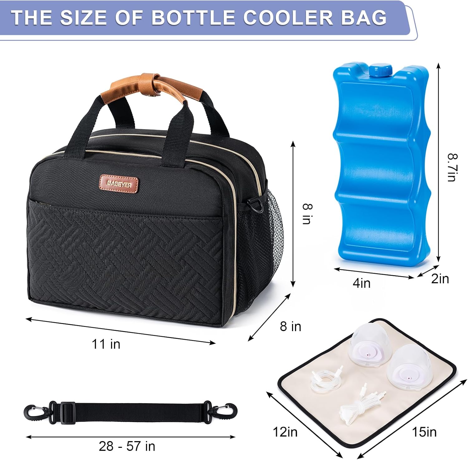 Easy to Carry: BABEYER breastmilk cooler bag come with an adjustable shoulder strap which can be cross-body over the shoulder. Comfortable leather handle for easy put on the stroller. Come with a PEVA waterproof mat, it can be used to place baby bottles, breast pumps & accessories