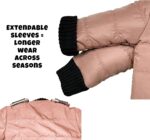 Now your child can wear their winter jacket in the car seat while still being able to secure the all-important car seat harness as if the jacket isn’t there. After securing the harness, easily close the jacket front panel over the harness.As your car warms up, it is simple to roll the front panel to the side to avoid your child overheating.Upon reaching your destination, reverse the process, remove Baby’s arms from the harness straps, and reclose the front of the jacket. Your baby is now ready to brave the elements without you having to struggle with putting a jacket on within the close confines of your car.Coats run large with extra length in the sleeves so parents can use the coats across seasons without “sizing up” and adding bulk to the back.