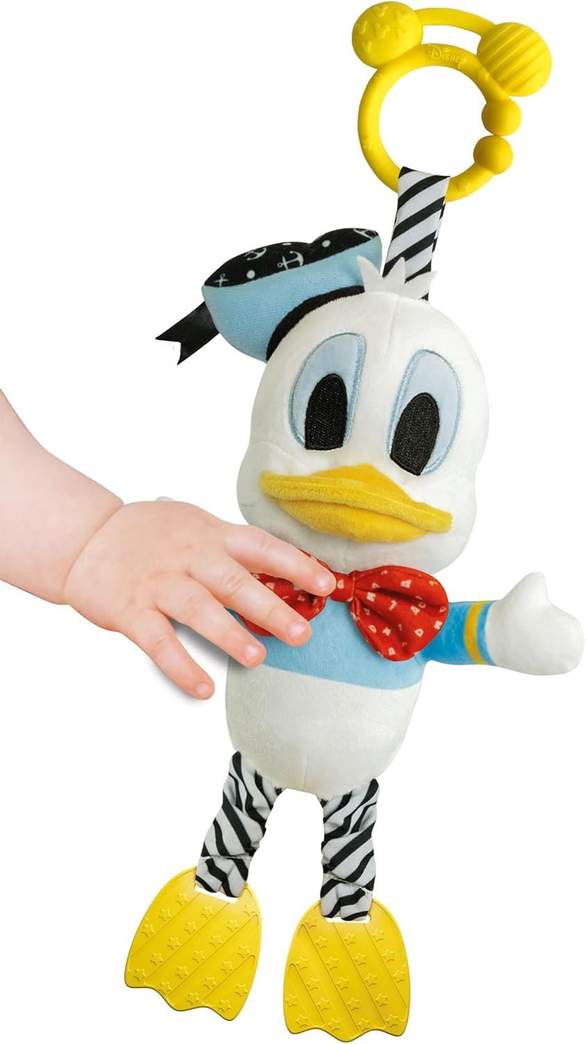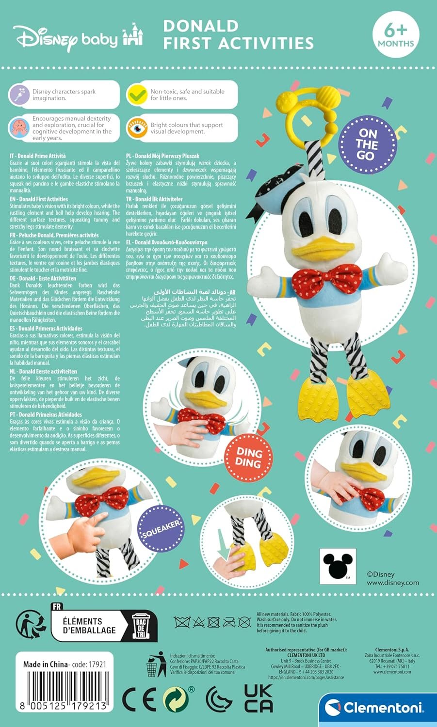 Clementoni Disney Baby Donald – First Activities Plush, Interactive Cuddly Toy with Rattle, Squeaker and Teething Ring, Promotes Sensory Skills and Teething from 6 Months