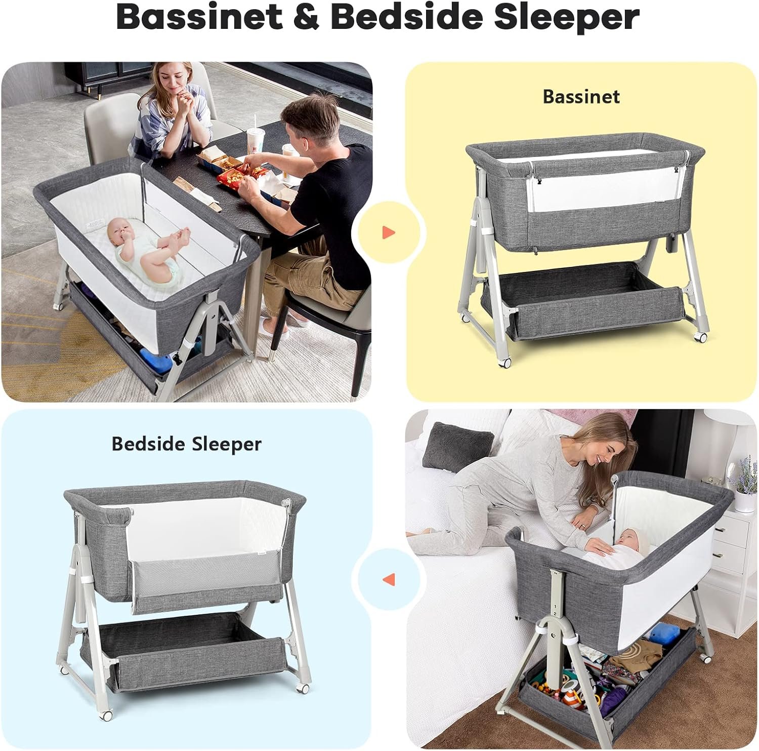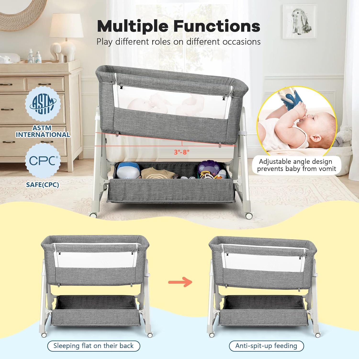 【3-in-1 Convertible Design Baby Bassinet】Use as a standalone bassinet, bedside sleeper (zippered side for easy breastfeeding), or angled crib to prevent spit-up. Ideal for C-section moms needing effortless nighttime care.