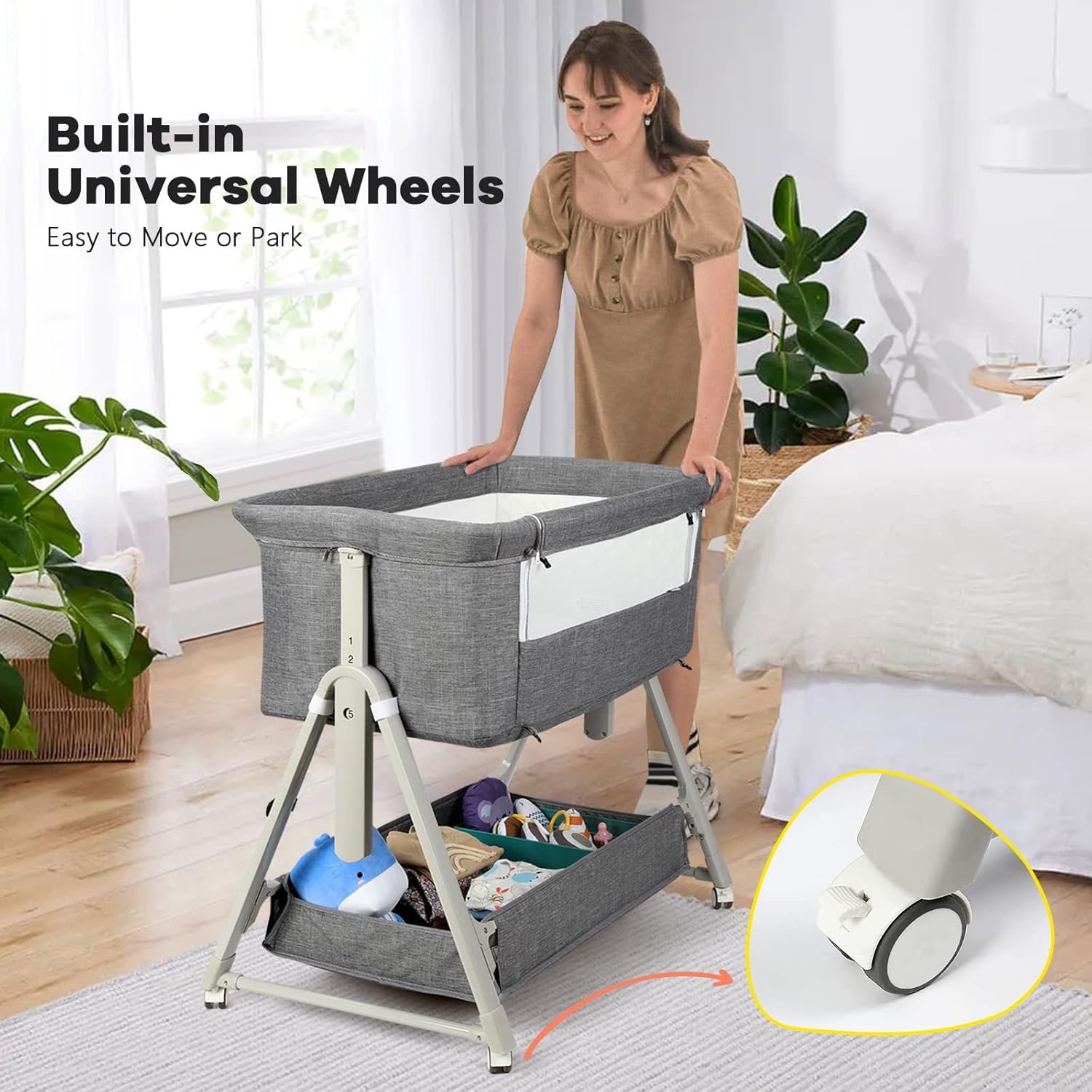 【Portable Bassinet for Travel-Ready】Tool-free setup, lightweight aircraft-grade aluminum frame, and 4 smooth-roll wheels let moms move the bassinet effortlessly. Includes a travel bag for grandparents’ homes or trips.