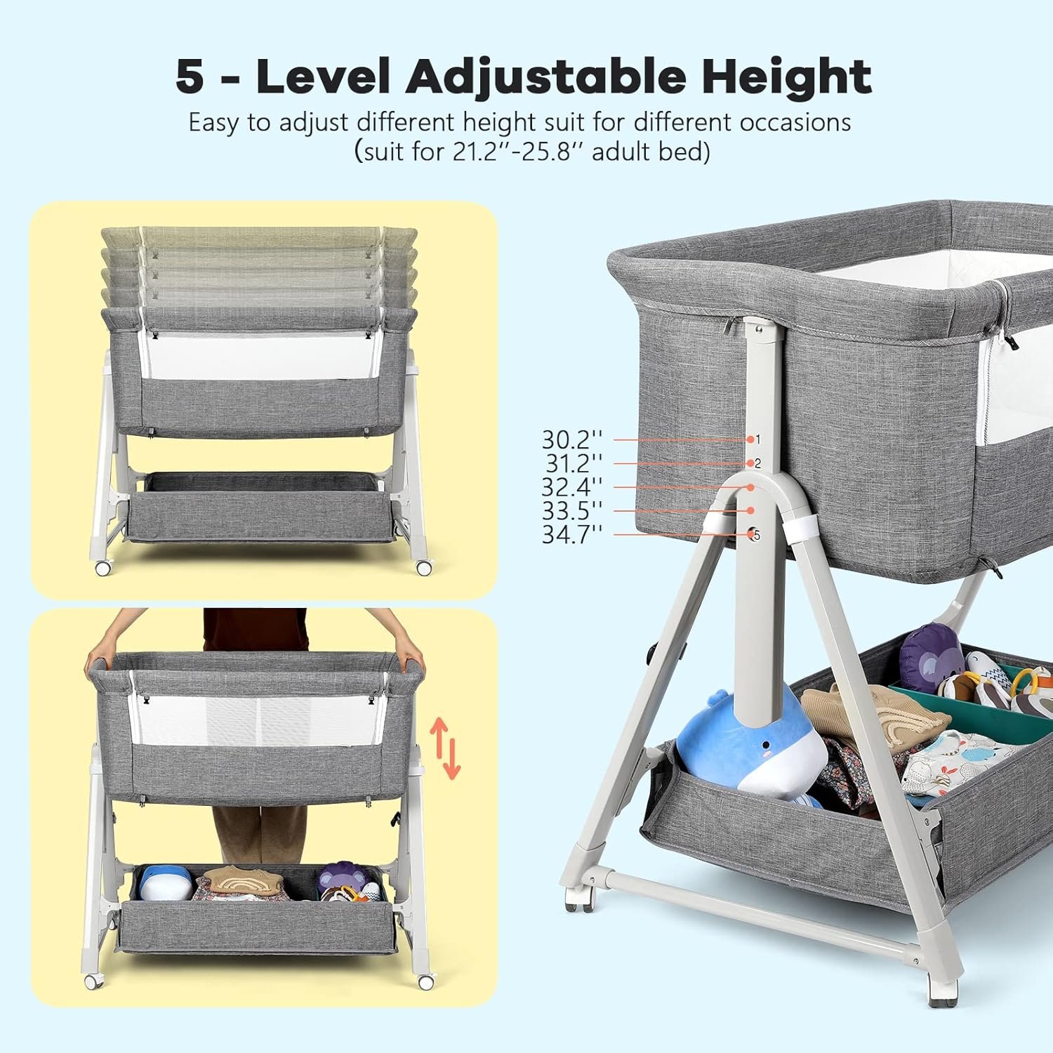 【5-Level Adjustable Height for Adult Mattress Compatibility】Cowiewie bedside bassinet designed for safe co-sleeping, the elevated base seamlessly aligns with standard adult mattresses (15-30 inches adjustable). Keep your baby at eye level while maintaining a safe, separate sleep space. Tilt feature aids digestion post-feeding (prevents reflux/spit-up).