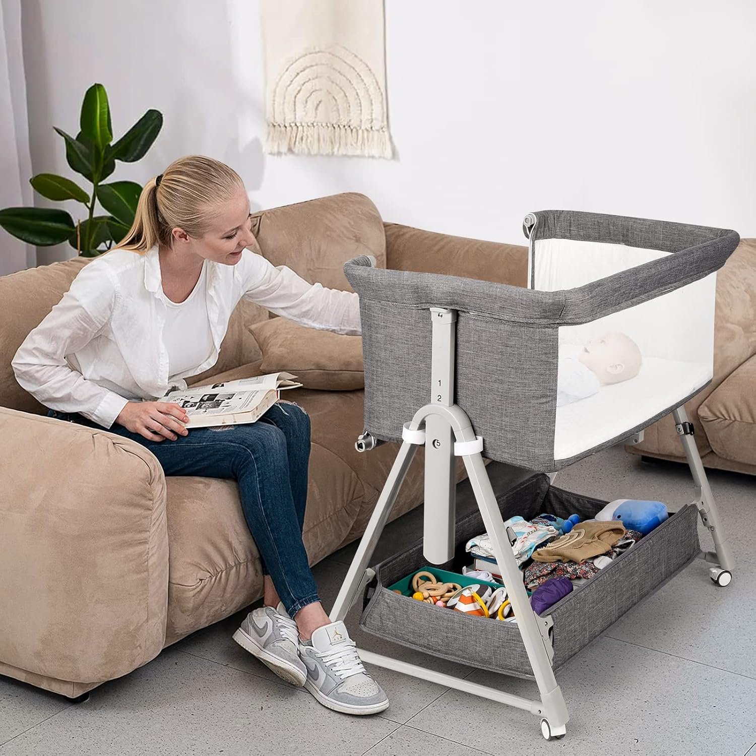 【Super XL Storage Basket keep everything at hand】Our bassinet bedside sleeper with XL storage basket holds wipes, diapers, lotions, creams, aspirator, toys, and extra changes of clothing there and still have storage left, keep everything at hand.