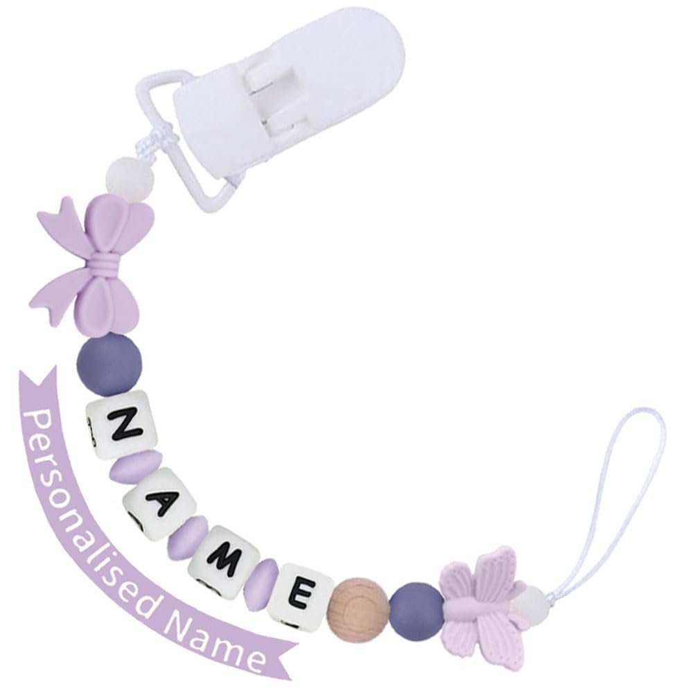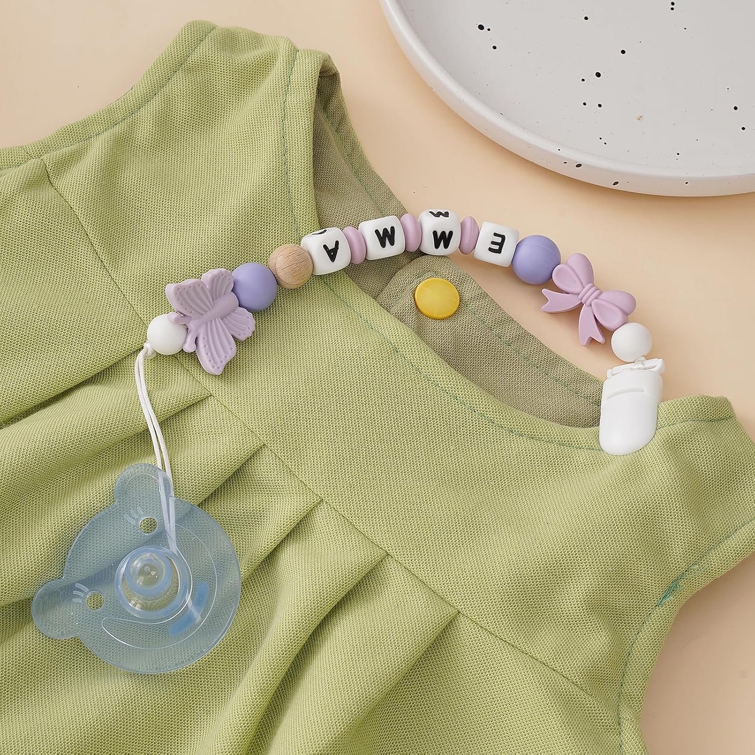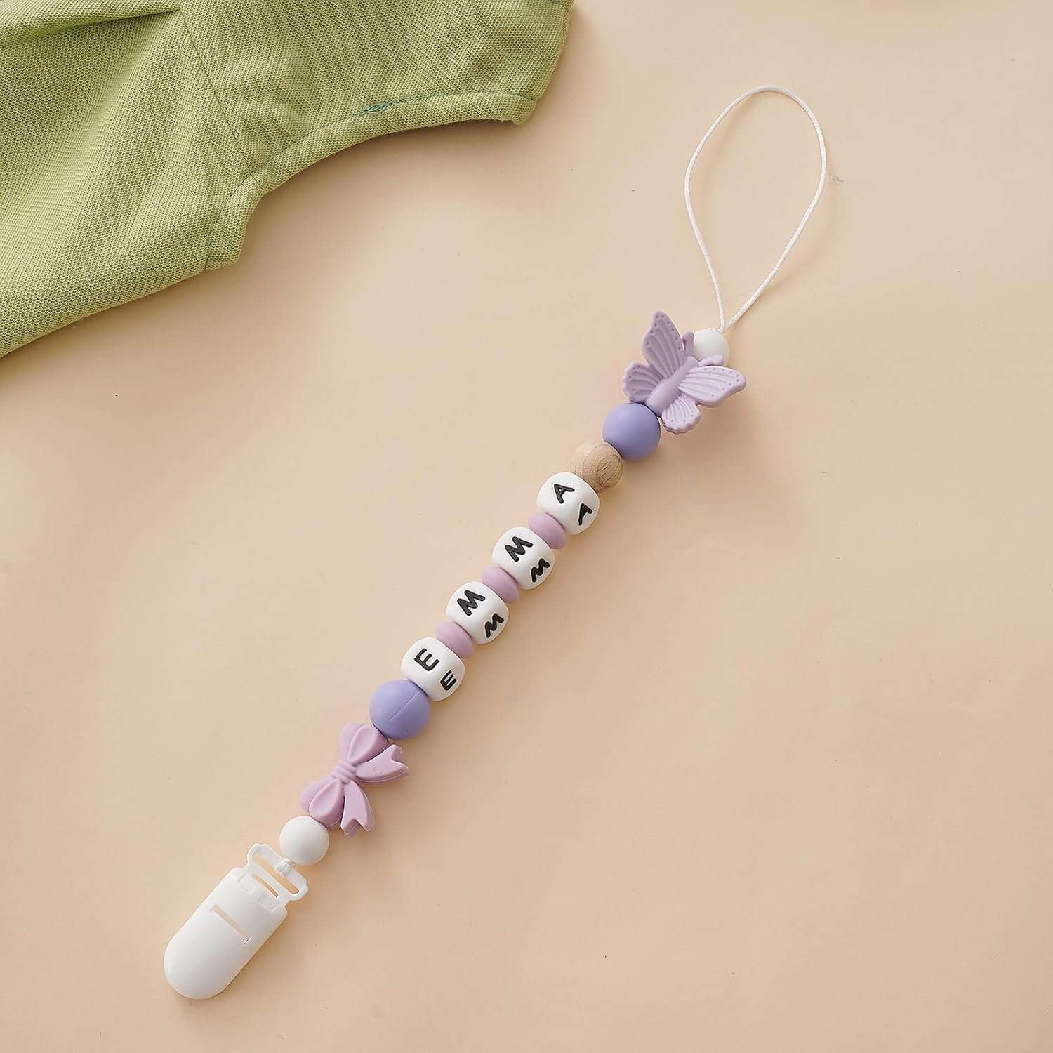 Personalized name pacifier clip Handmade with purple circular 15mm silicone beads and butterfly, with the baby’s name on them