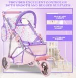 Jogger Style Baby Doll Stroller: Our 3 wheel jogging stroller features a 21 inch frame with adjustable canopy and spacious storage basket; designed for smooth maneuverability on any surface; fits 12 to 18″ dolls ideal for kids’ imaginative adventures on various terrains