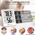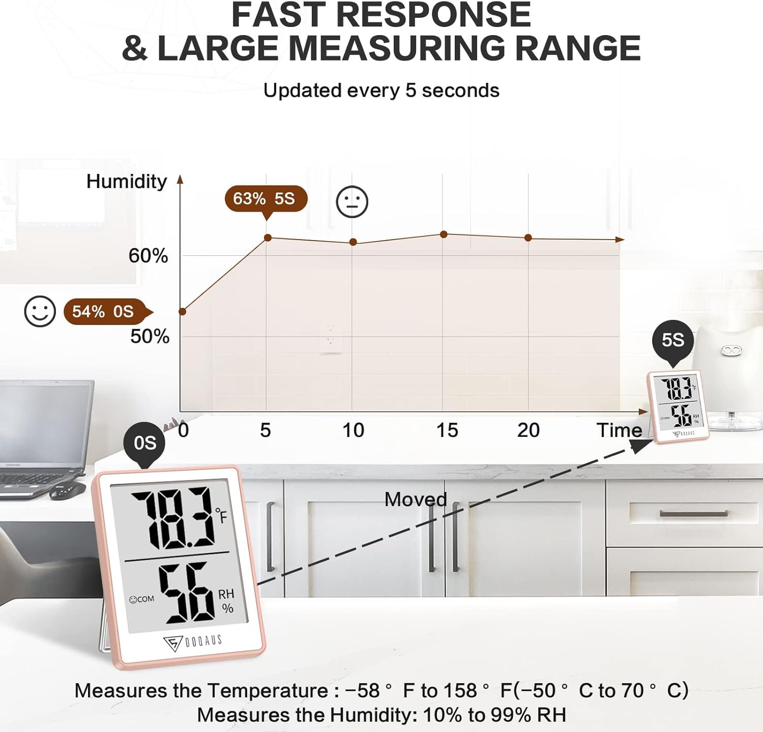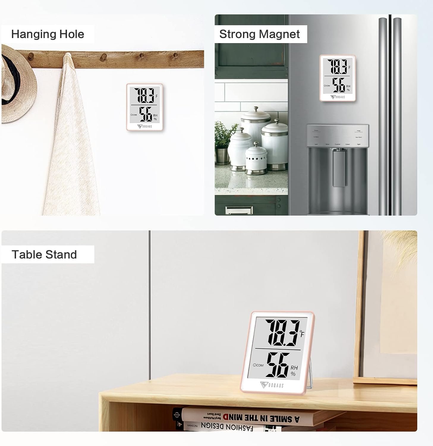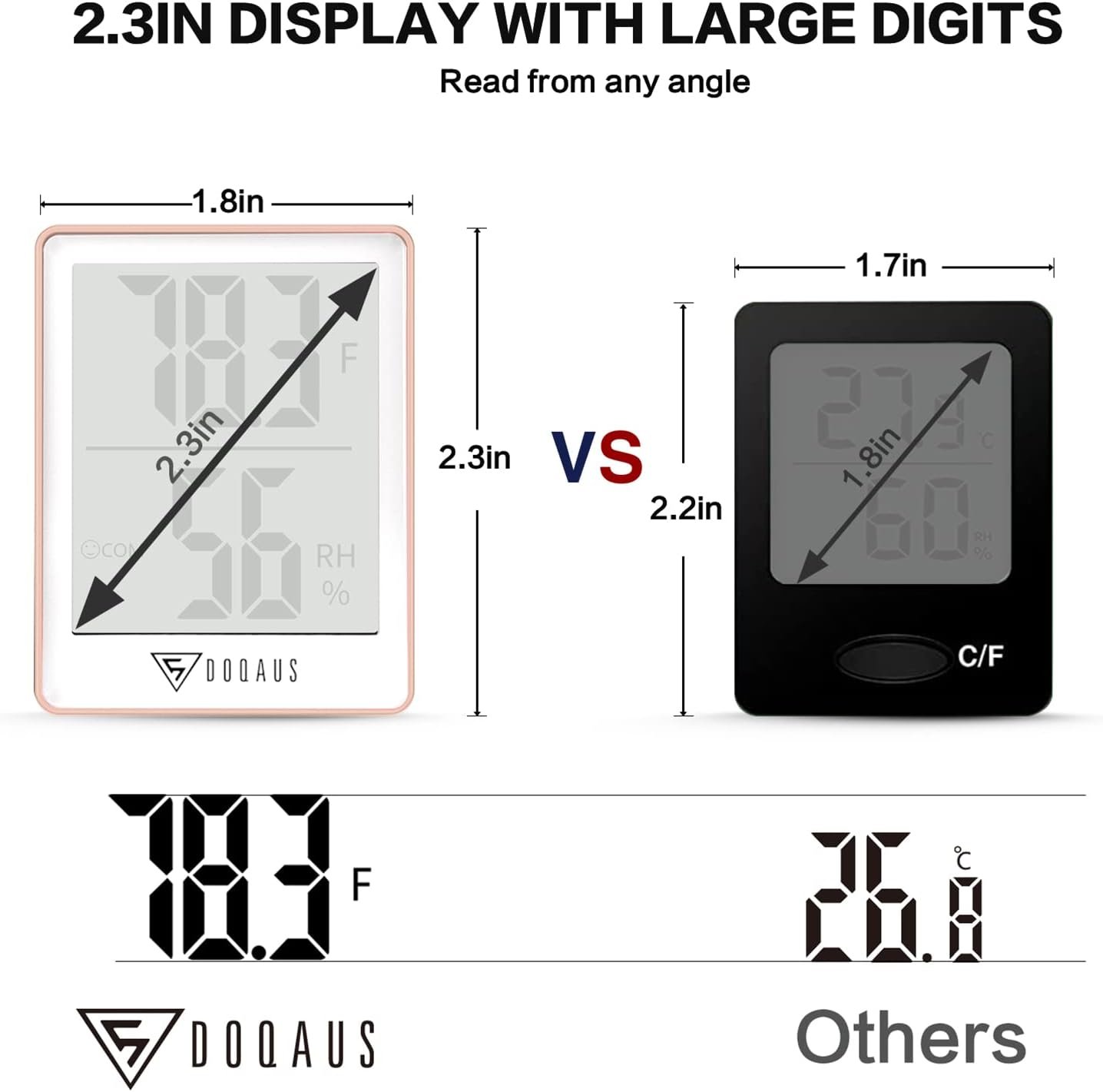 ????[Pocket Size & Maximize Space]: Compact and lightweight design, DOQAUS thermometer indoor allows you easily put them in your pocket and take it anywhere you want. Also, the humidity sensor is great for space-saving