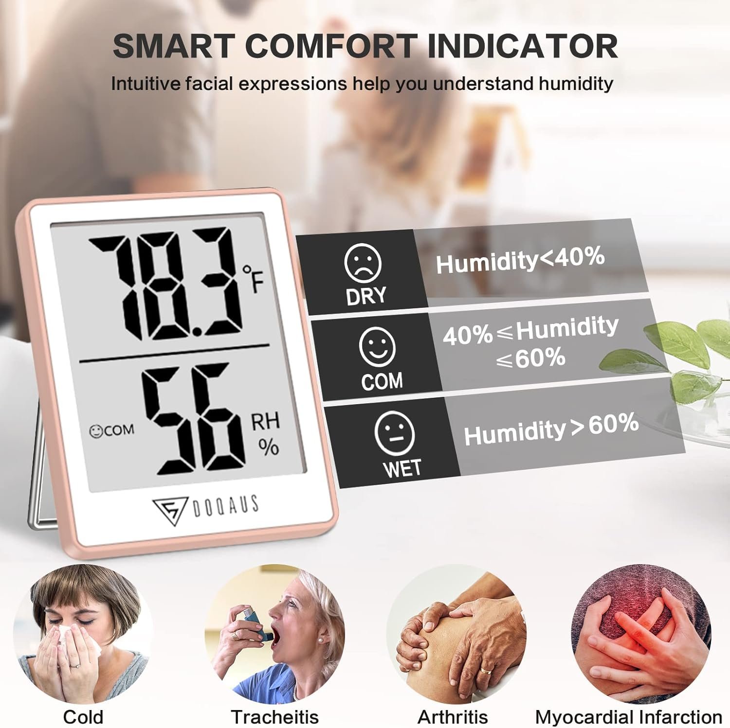 ????[Air Comfort Indicator]: DOQAUS humidity meter features 3 different face icons to indicate DRY/COMFORT/WET air condition, keeping you aware of house situation with just a glance and helping adjust your humidifier or dehumidifier to achieve optimal comfort