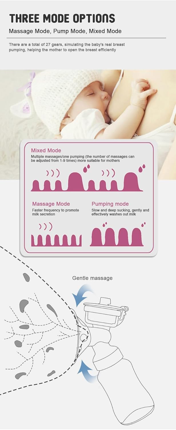 Automatic Pumping: Mimics natural breastfeeding with automatic cycling and adjustable suction levels.
