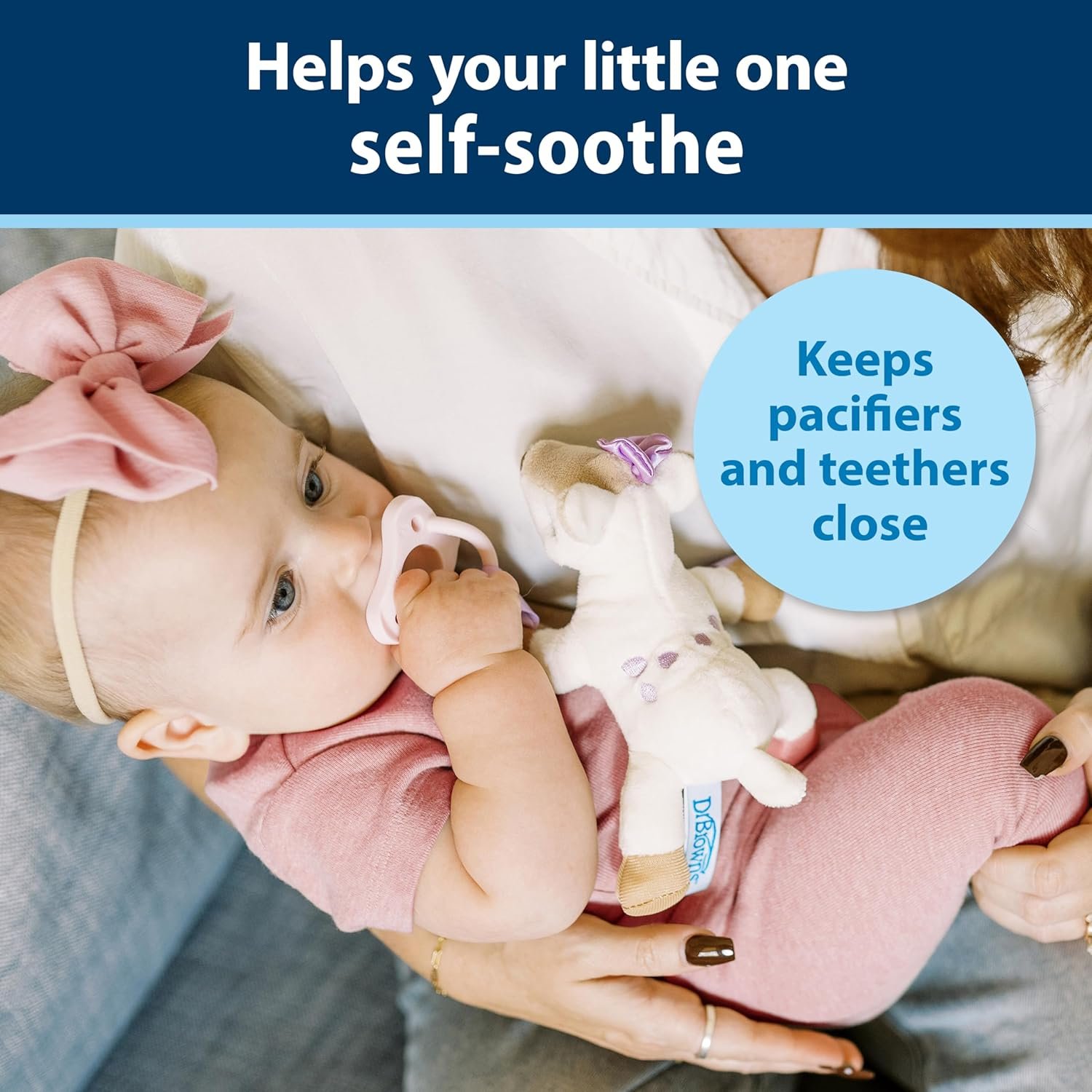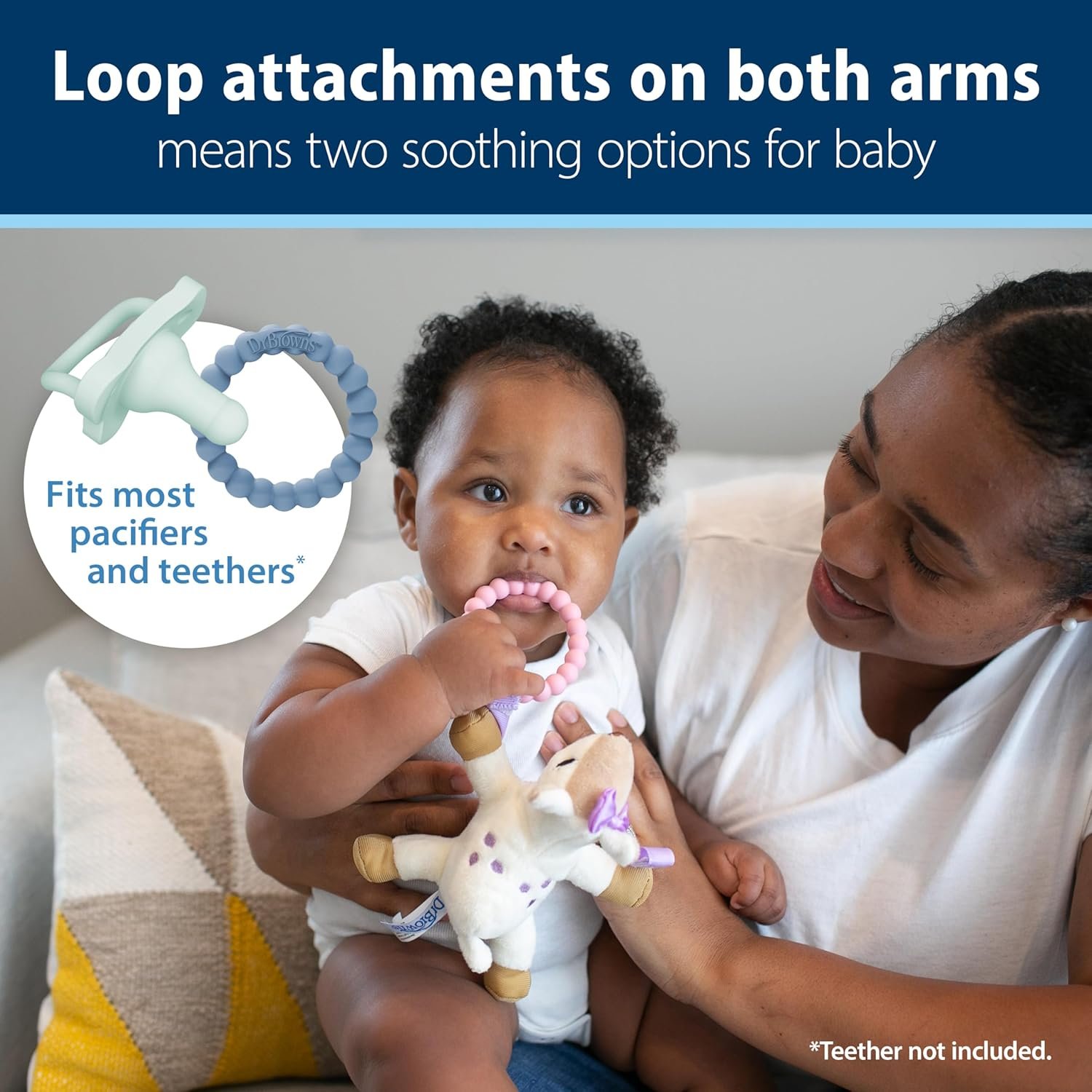 BABY PACIFIER and TEETHER HOLDER. Designed to keep baby’s pacis and teethers close by, the Lovey securely holds most pacifiers and teethers and includes a 100% silicone Dr. Brown’s HappyPaci pacifier.