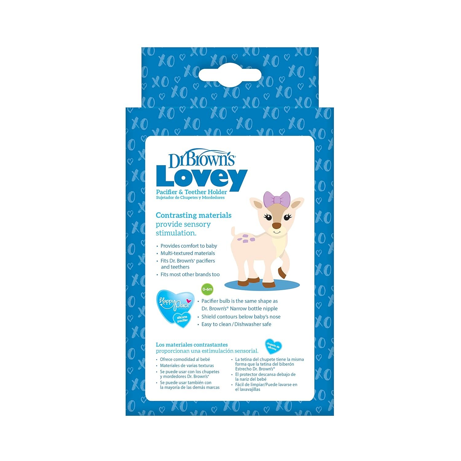 The best things in life are made with Lovey! Dr. Brown’s Lovey Pacifier and Teether Holder is the perfect companion for your little one’s self-soothing journey. This adorable Lovey is designed to keep pacifiers and teethers close by, so your baby can effortlessly soothe themselves when needed. With cuddly, multi-textured fabrics for a tactile experience and a sturdy design that holds up to the wear and tear of a well-loved toy, it is the ultimate baby essential. Each Lovey comes with a Dr. Brown’s 100% silicone HappyPaci pacifier, shaped just like Dr. Brown’s bottle nipples for easy acceptance and a happy baby! Loop attachments on both Lovey arms means two options for baby – making it easier for little hands to find, grip, and self-soothe. Secure loops ensure removable pacifiers and teethers won’t fall off and get lost. The Lovey holds any of Dr. Brown’s pacifiers and teethers and most other brands. The Lovey is machine washable and the HappyPaci pacifier is dishwasher (top rack) and sterilizer safe. BPA free.