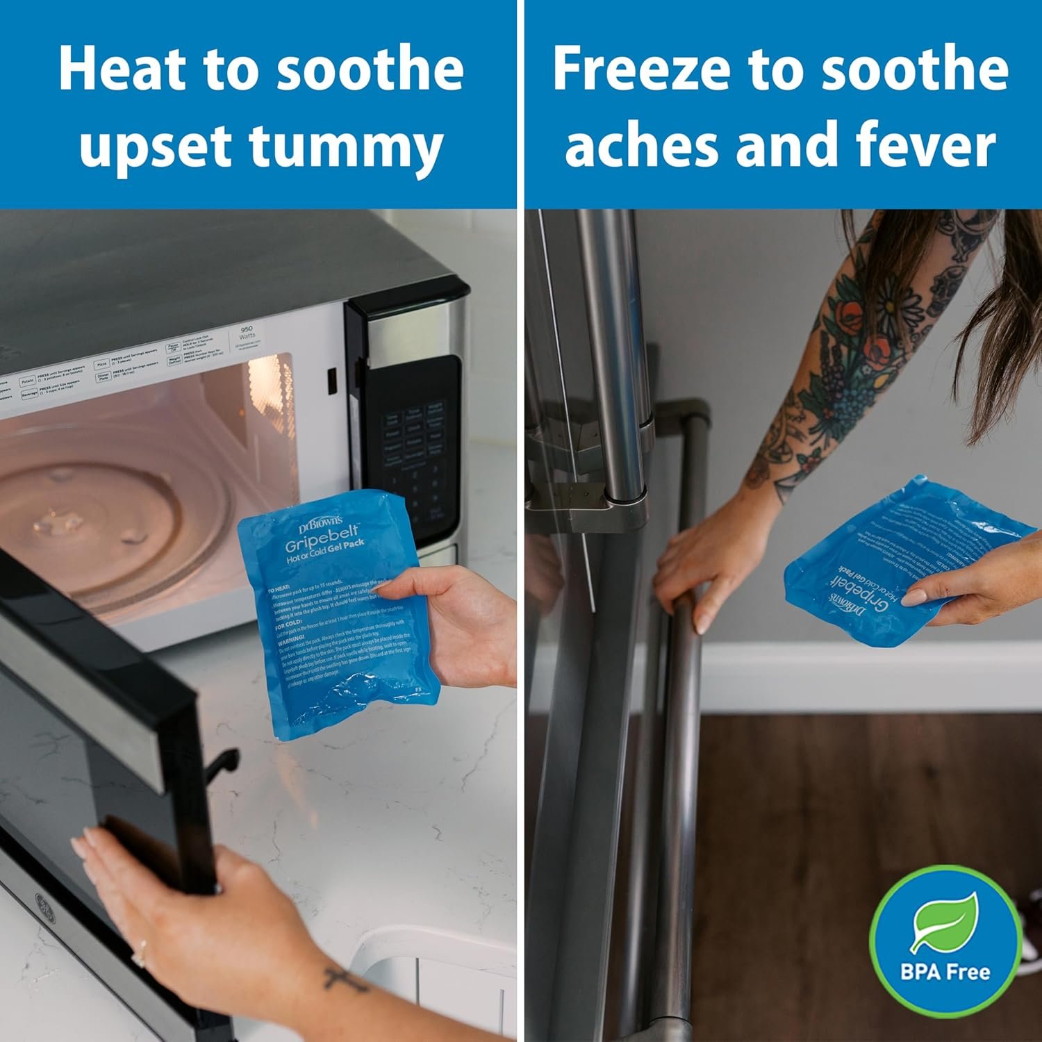 QUICK AND CONVENIENT. The Gripebelt comes with a microwaveable hot pack and is easy to assemble. Simply warm the included clay pack in the microwave for 10 seconds, insert the warmed pack into the belt, and secure the adjustable belt to gently compress baby’s belly.