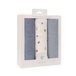 This trio features three modern, lively styles — 2 classic shades of blue and a coordinating cream with a nautical print. These three stylishly designed swaddle blankets bundled in our gift-ready packaging make this set a perfect baby shower present for the baby boy in your life.