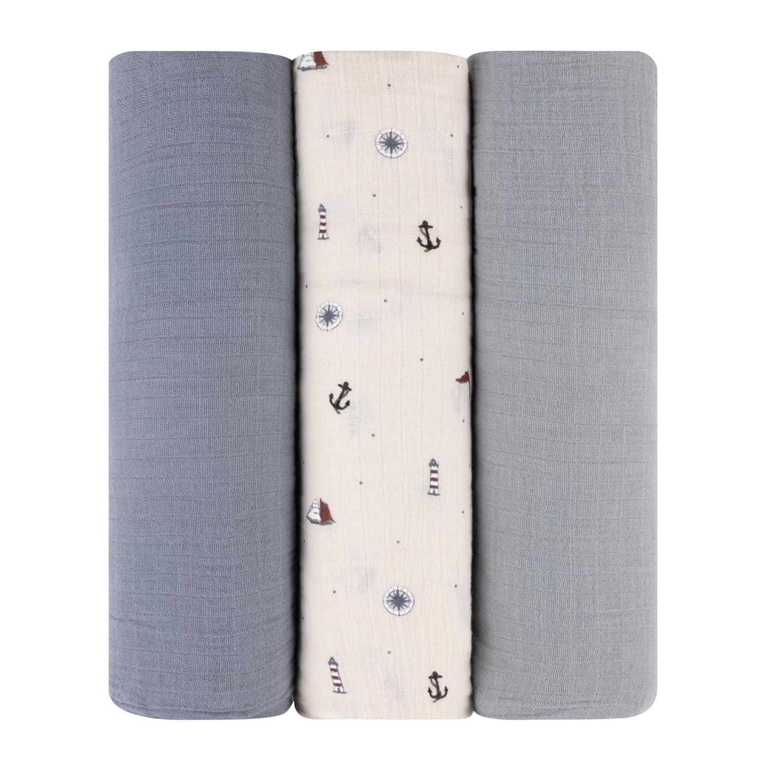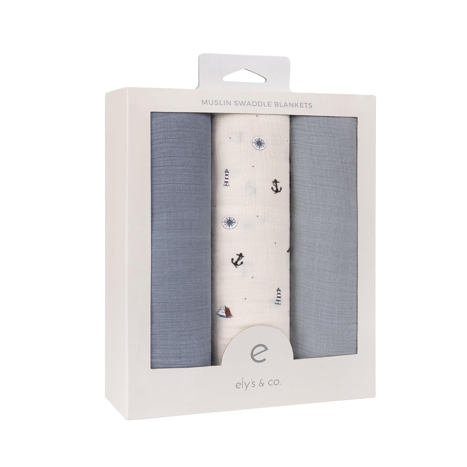 Ely’s & Co. Muslin Swaddle Blankets 3-Pack for Baby Boy, 100% Cotton Muslin Extra Large Swaddle Receiving Blankets, 47”x47” (Blue-Ivory Nautical)
