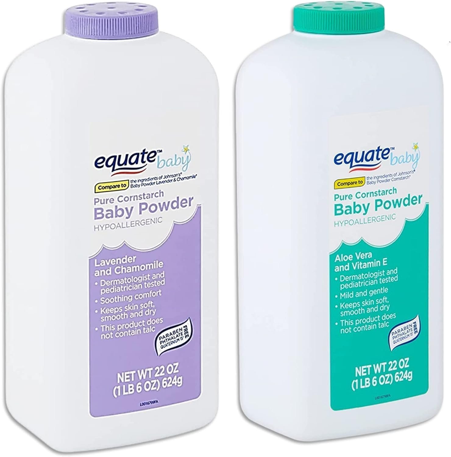 Equate Pure Cornstarch Baby Powder Bundle-Includes 1 Pack 22 Oz Equate Lavender Chamomile, 1 Pack 22 Oz Equate Aloe Vera Vitamin E