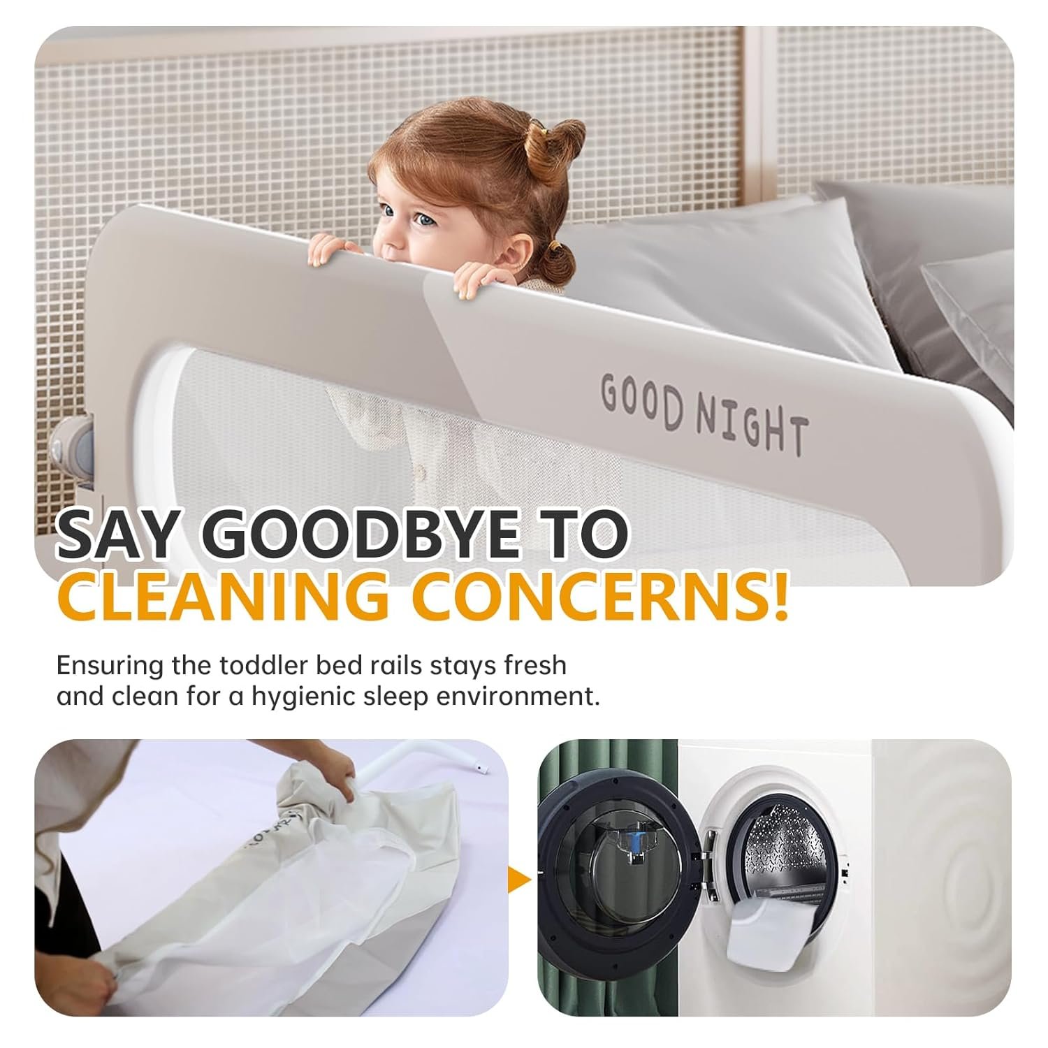 Smart Foldable-Swing Rails Design: Our toddler bed rails featuring a one-click button for effortless folding and swinging. Guardrail with 25 speed adjustable height for different thickness mattress, making co-sleeping convenience. As bedtime approaches, parents fold down the crib rail by pressing the button, creating a snug haven for bedtime stories and comforting moments. Elevate your sleep time.