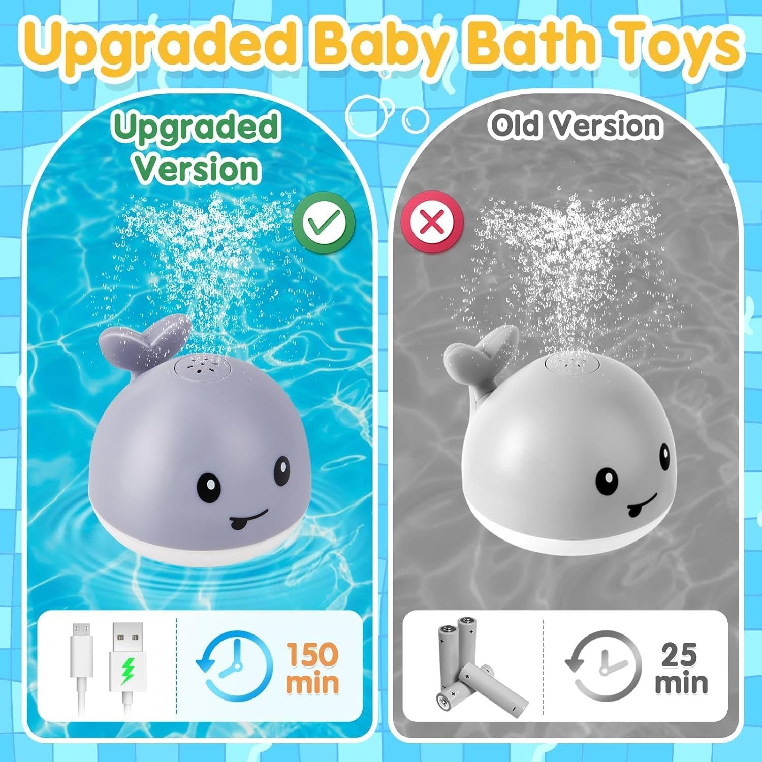 Upgraded Baby Bath Toy: We understand your concerns about water damage and the toy not lasting long enough. But don’t worry! We’ve made some awesome upgrades to address those issues. The whale bath toy now has a power switch(ON/OFF), is double-layer waterproof, and can be recharged. The water spraying time of our 1500 mAh rechargeable battery is 4 times that of battery, and don’t need to replace batteries anymore