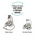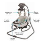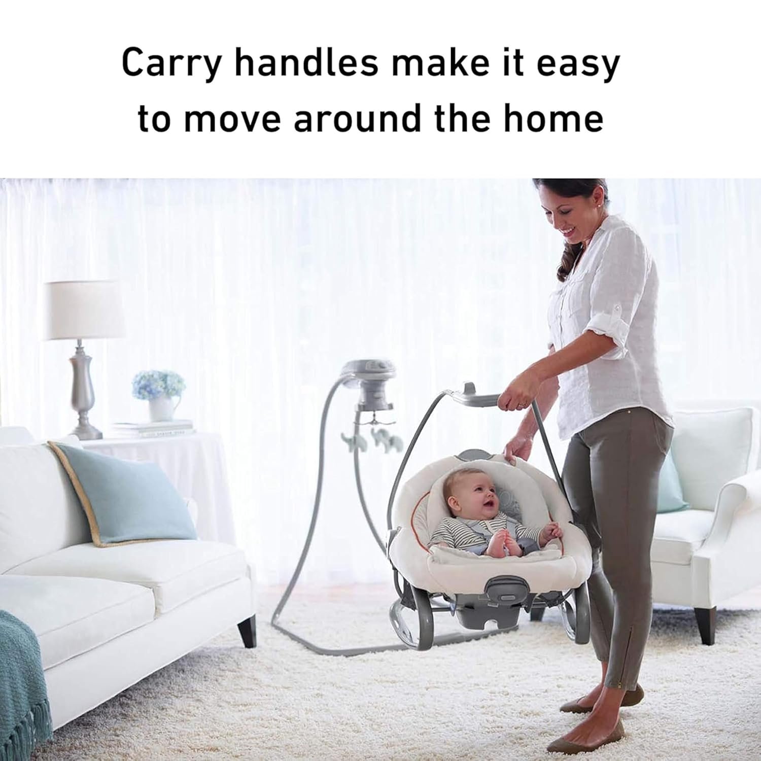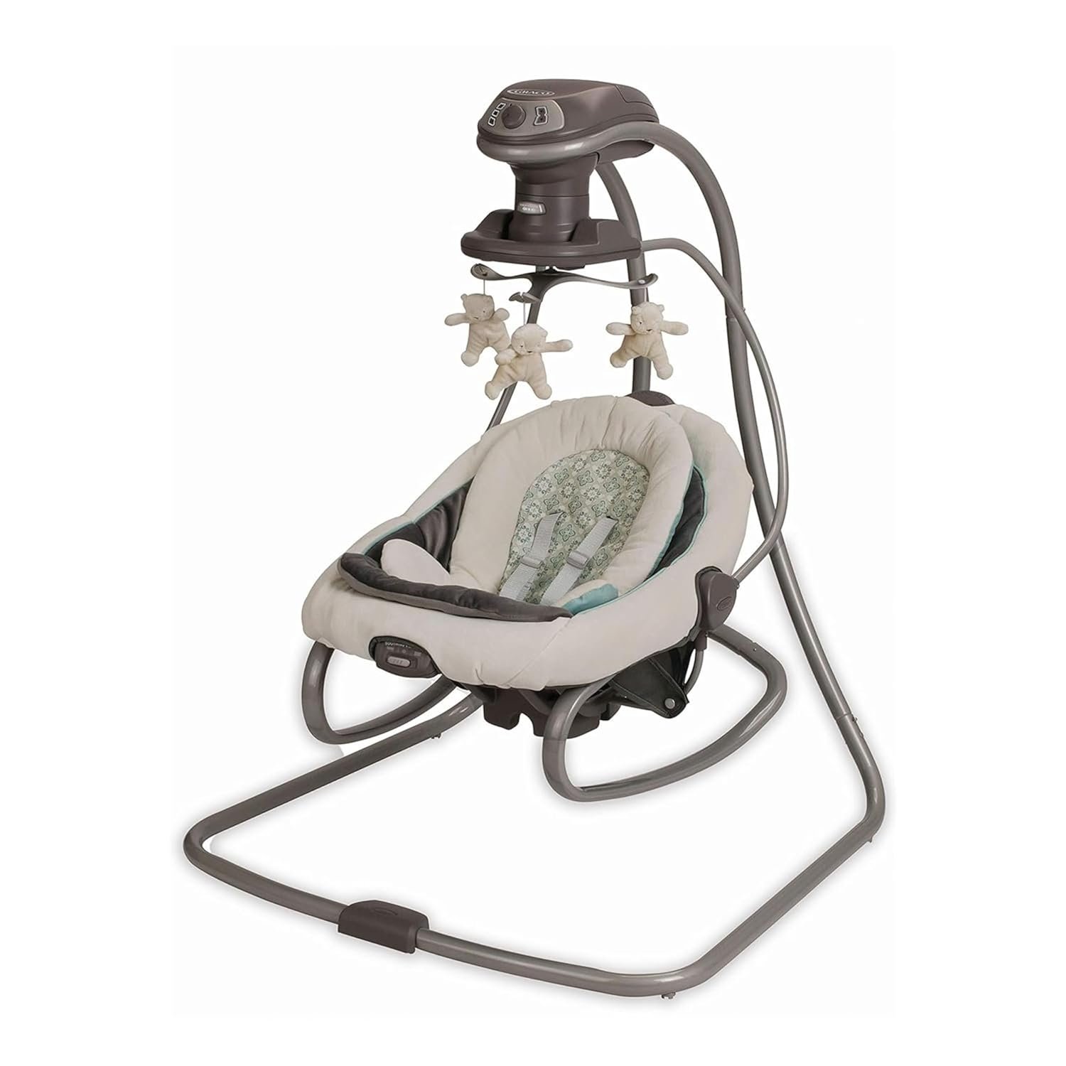 The Graco® DuetSoothe™ Swing and Rocker features an ingenious seat that doubles as a portable rocker, giving you the flexibility to move around the house while keeping baby cozy and close by. In swing mode, 3 swinging directions and 6 speeds allow you to customize the swing to baby’s preferences. With additional features including 2-speed vibration, an overhead toy mobile, and soothing songs and sounds, the Graco® DuetSoothe™ Swing and Rocker gives you even more options to keep baby content.
