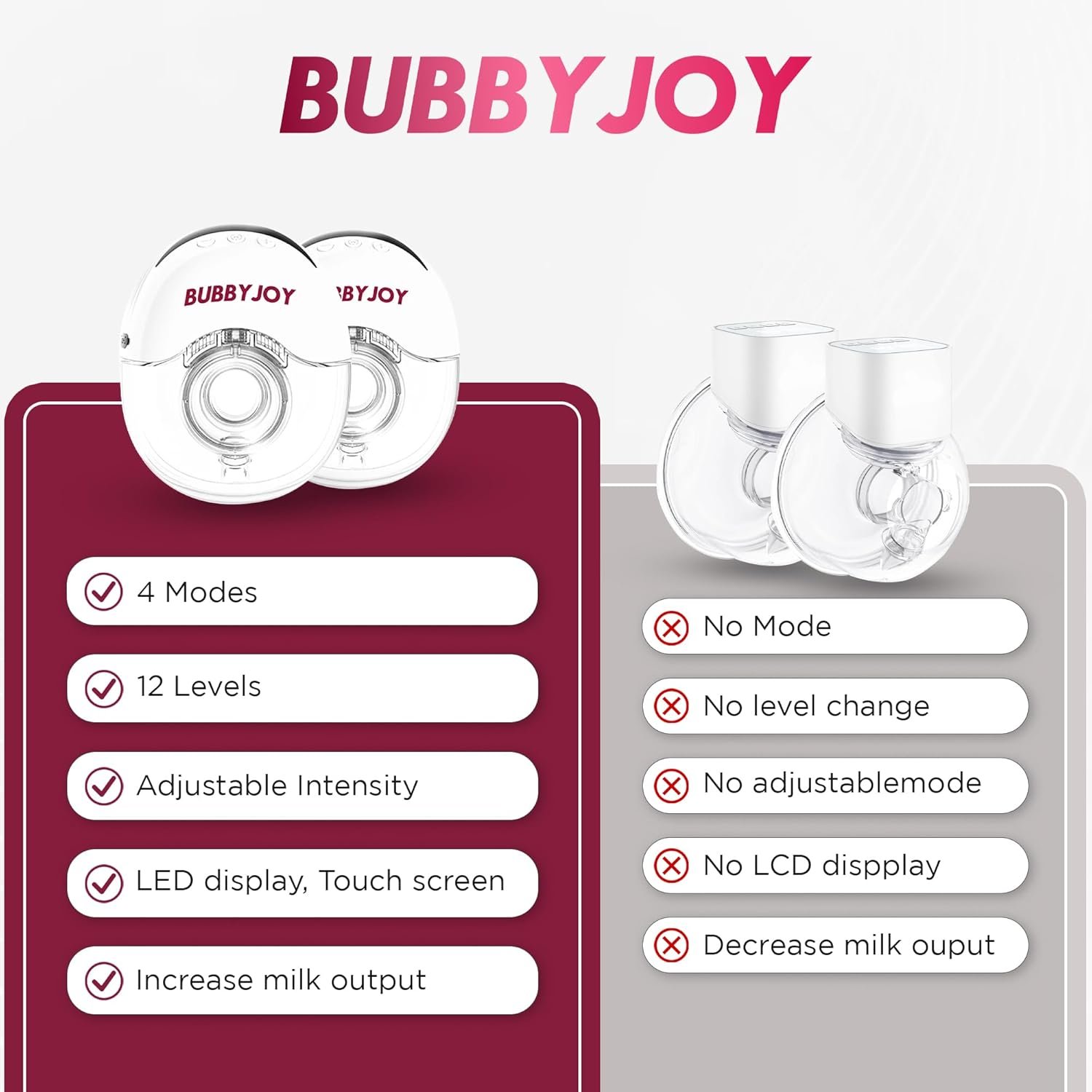 ULTRA-QUIET OPERATION – DISCREET & POWERFUL SUCTION: The BUBBYJOY Hands-Free Wearable Breast Pump delivers strong suction with minimal noise, operating at a low 45-60dB sound level. This ensures discreet pumping in quiet environments, whether you’re at work, traveling, or in a shared space, allowing you to express milk without disturbing others.