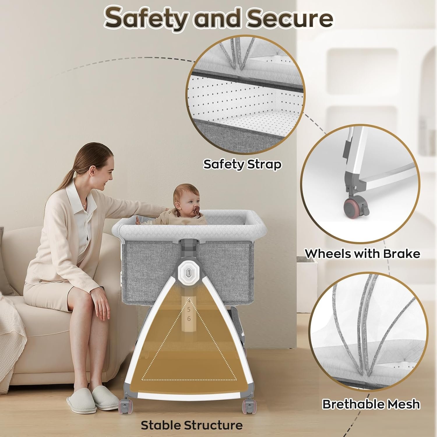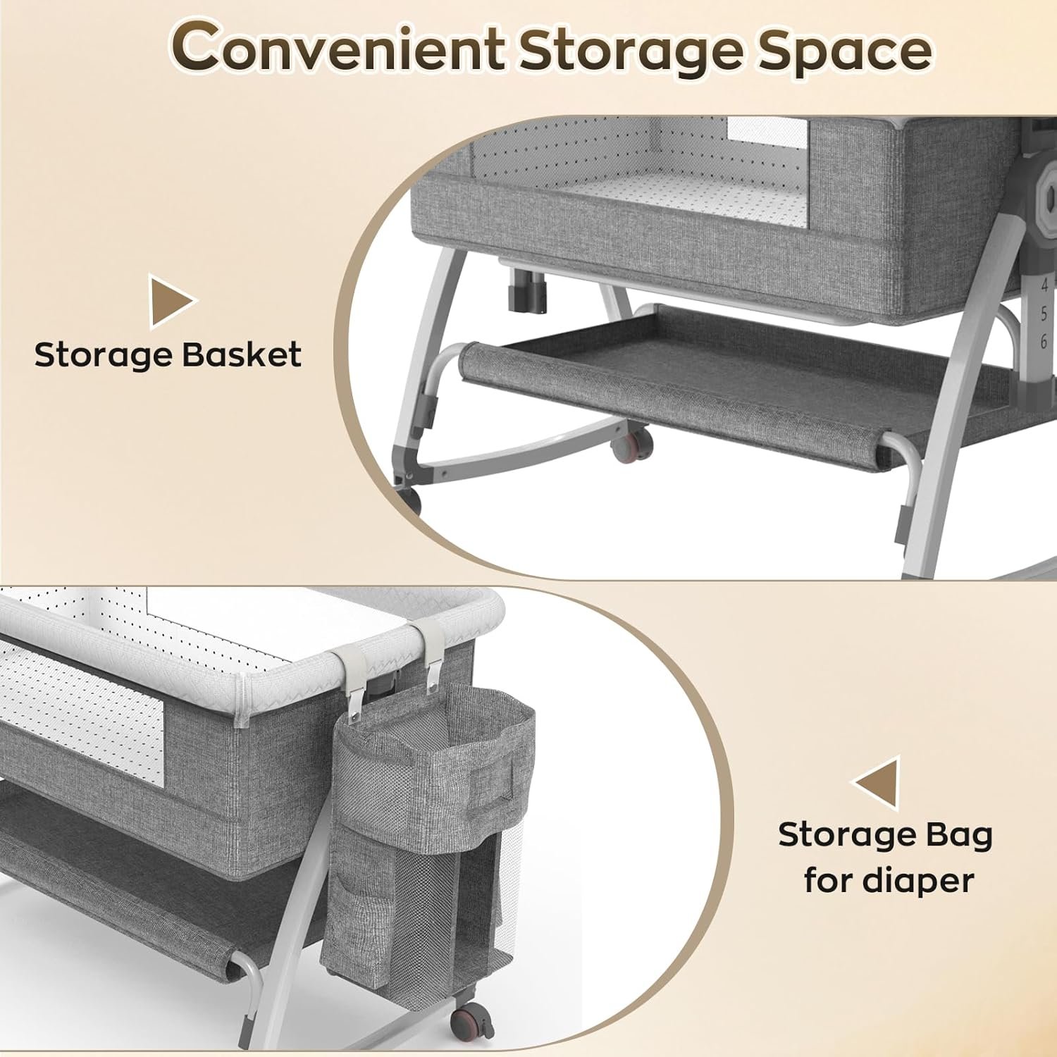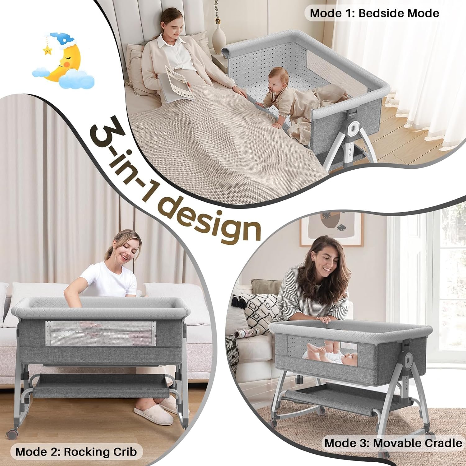 3-in-1 Versatile Use: Functions as a bedside sleeper, a soothing rocking crib, or a movable cradle—designed to meet different parenting needs throughout the day and night.