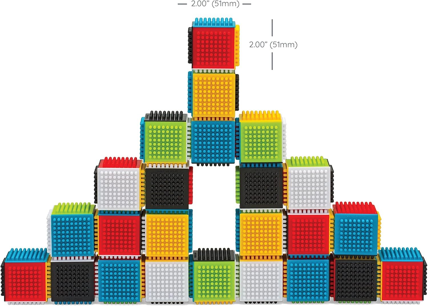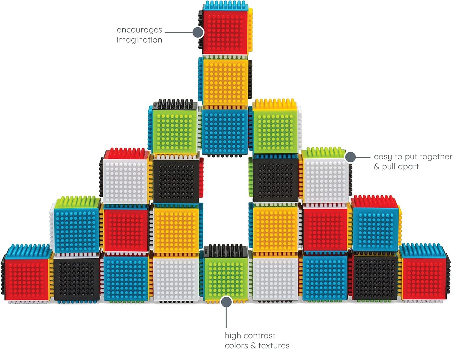 Infantino Sensory Press & Stay Sensory Blocks. 24 Blocks in the set. Encourage imagination and eliminate frustration with a building block set that is easy for even the youngest builders to attach and stack together into fun shapes, high towers and endless possibilities. No need to align the blocks perfectly – the interlocking pattern makes it easy to attach and pull apart. Stack up or even build sideways!