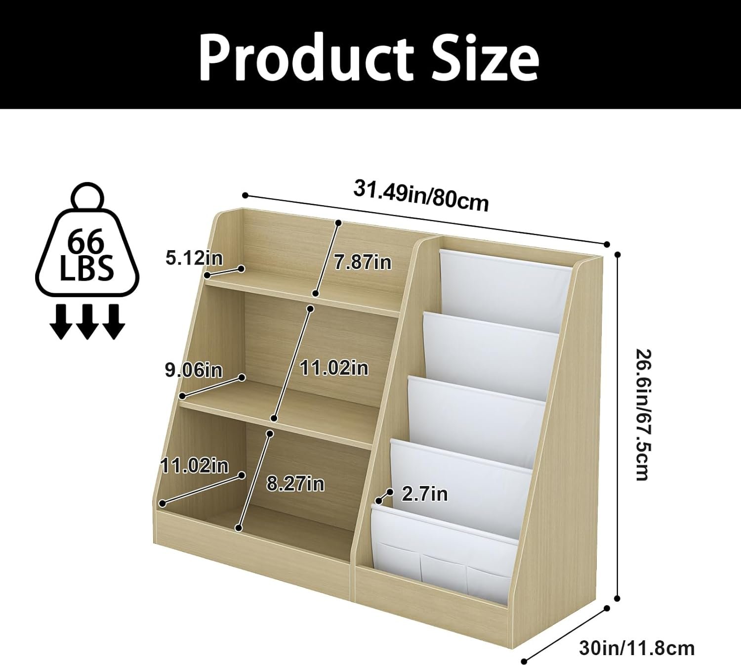 Product Dimensions 11.8″D x 35.4″W x 26.6″H Material MDF Board+Fabric Bag Weight Capacity Kids booshelf can hold up to 66lbs Easy Assembly Easily done in 15 minutes Color Natural Place of use Playroom, Classroom, Nursery, Bedroom, Living Room