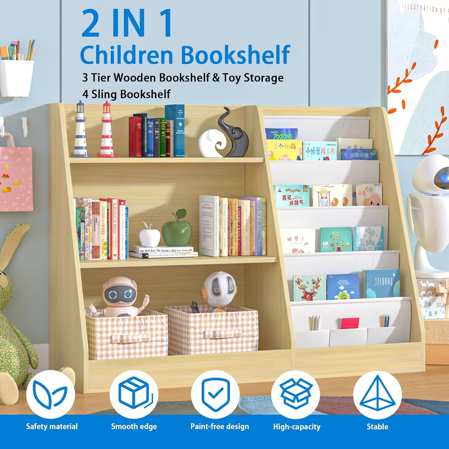 Kids Bookshelf and Toy Storage, 3 Tier Wooden Kids Bookcase with Storage, Floor-to-Ceiling Baby Book Organizer with Sling, Children Book Rack for Playroom, Classroom, Nursery, Natural