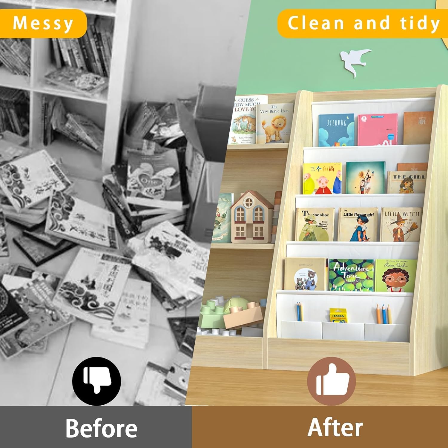 【Practical Storage Bag】: This bookcase designed for children incorporates a thoughtful storage experience. kids bookshelf is cleverly configured with 5 organizer bags, each of which is spacious enough. Nursery book shelf can organize and display books with front-facing covers, easy for children to identify and grab. The overall dimensions of the bookcase for kids rooms are 11.8″D x 31.5″W x 26.6″H.