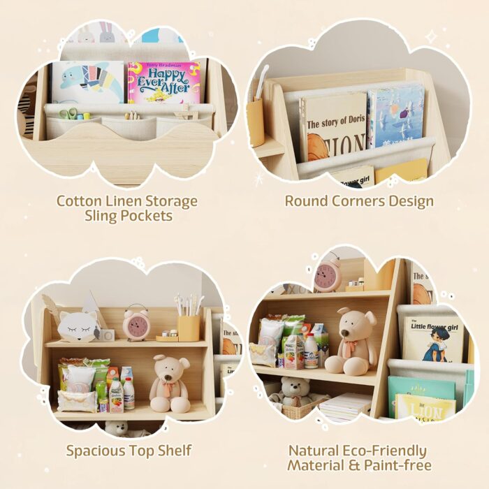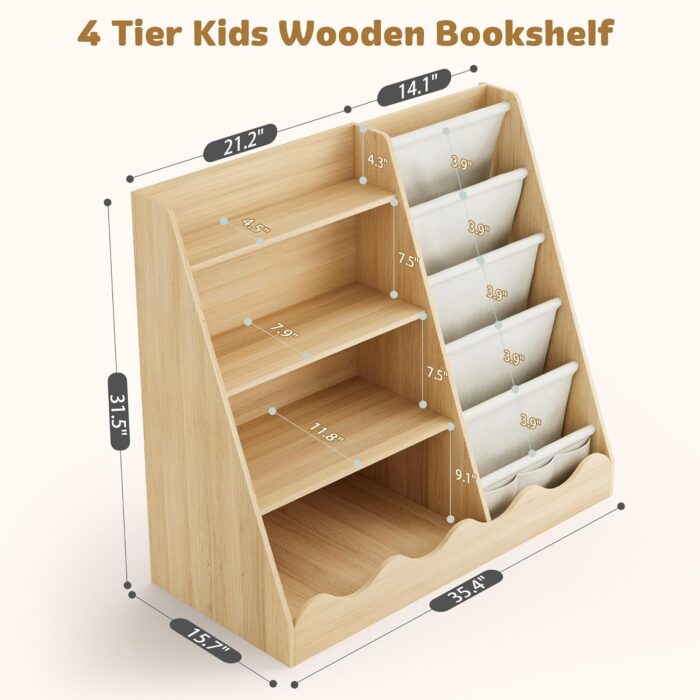Plenty of storage space: Designed with soft fabric pockets great for books. This 5 shelf bookcase keeps your child’s books organized, with deep fabric pockets that are easy for little hands to reach. The spacious top shelf is great for storing toys. They’ll love having their favorite books and toys neatly stored and within reach, encouraging independence and a sense of pride in their space
