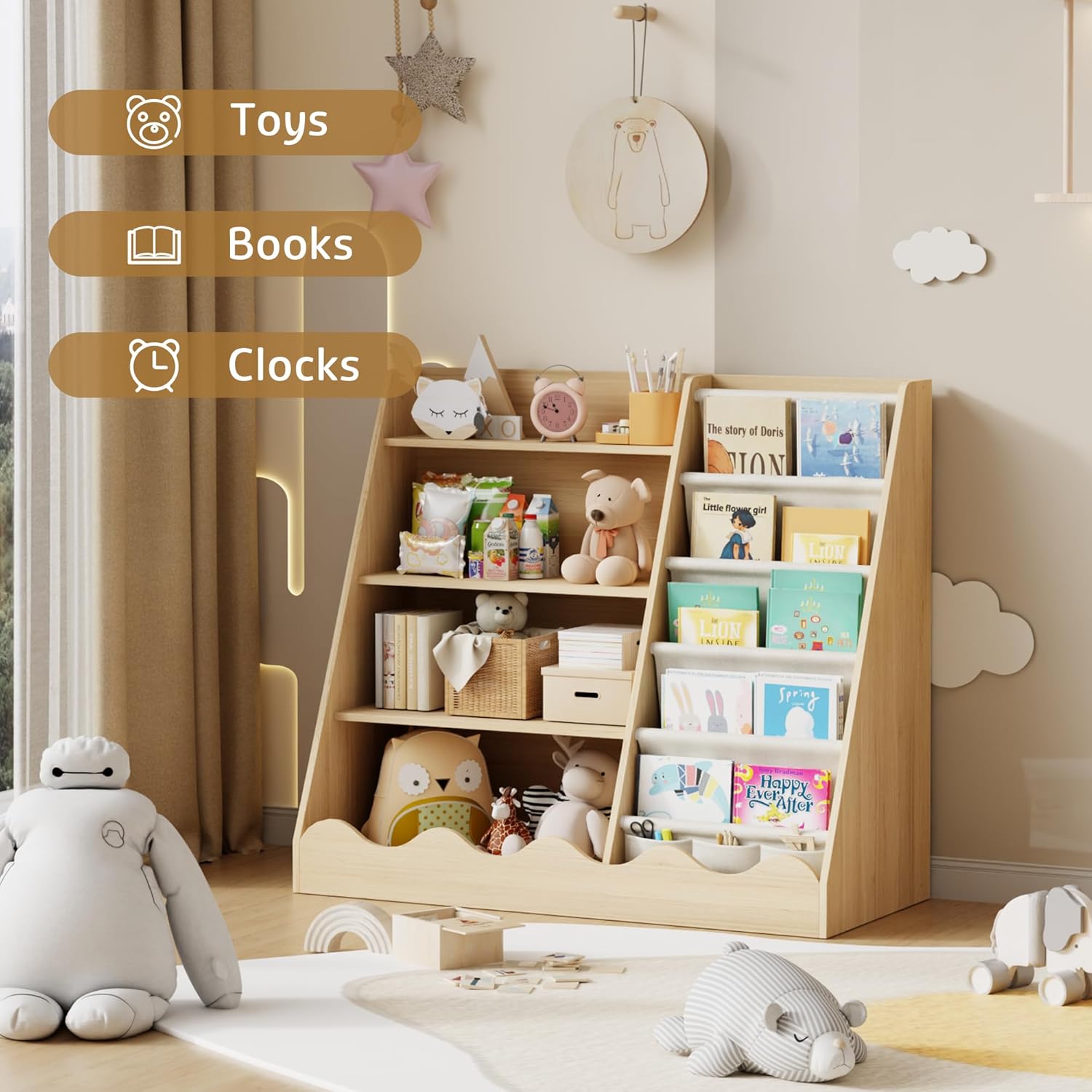 Versatility Meets Style: Our baby bookshelf is a blend of practicality and style. With its soothing wood pattern and colors, the toy and book organizer for kids creates a calming atmosphere, perfect for inspiring creativity. The smooth surface makes it safe and comfortable for little hands, ensuring a secure, kid-friendly experience. Its sleek design is a great fit for any child’s room, playroom, or bedroom