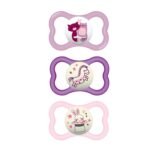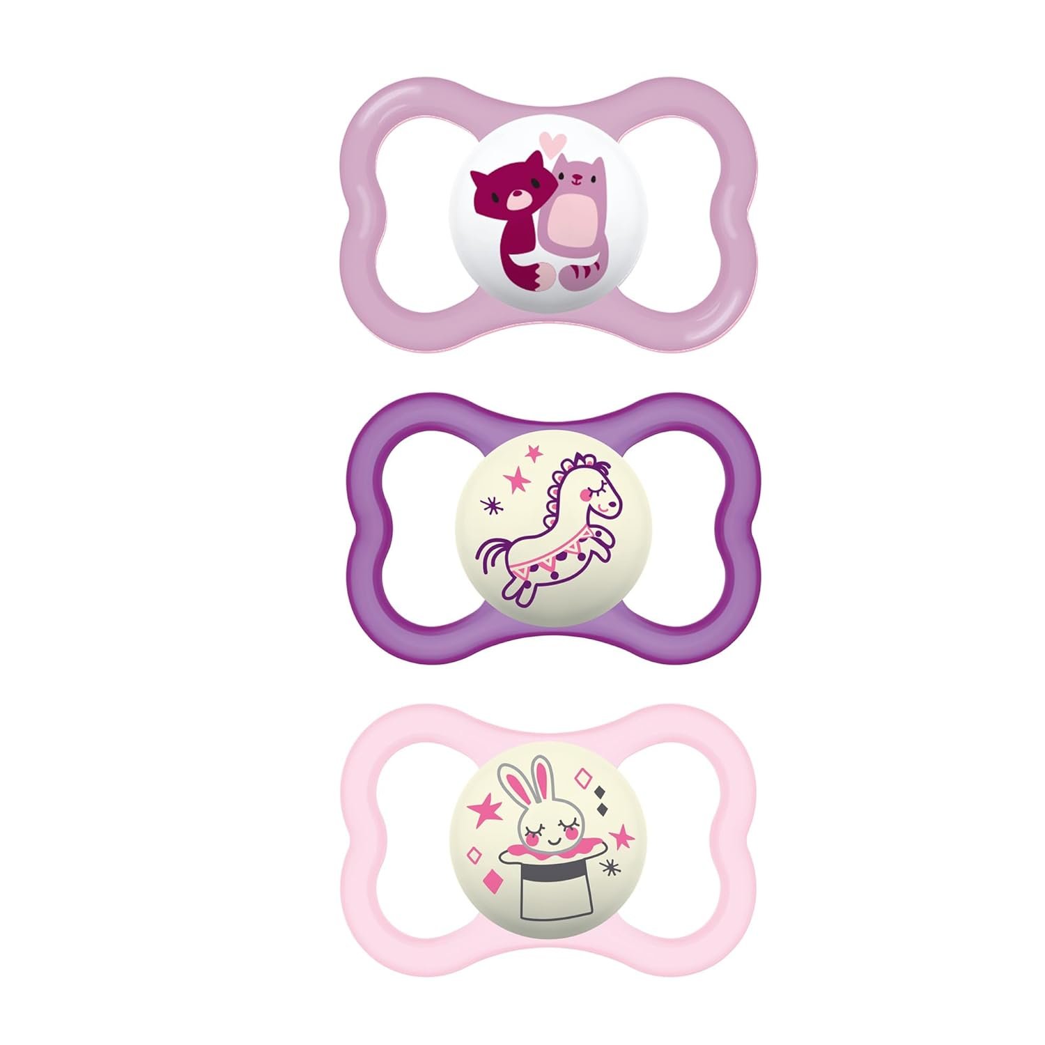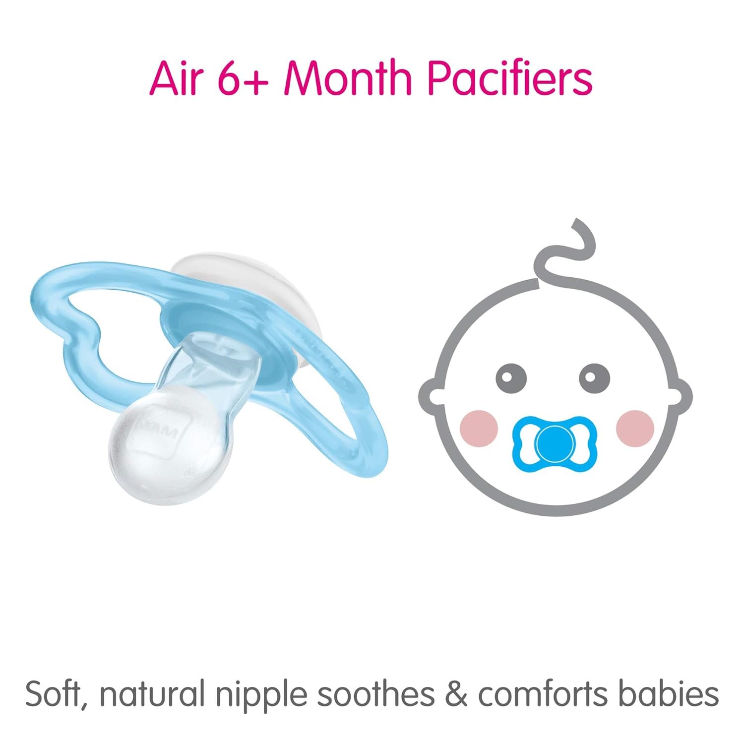 The MAM Air Day & Night Collection pacifiers for baby has a shield that is specially designed for babies 6+ months with sensitive skin. The extra wide air holes allow plenty of circulation around your baby’s mouth and even allow you to peek at their little smile. One pacifier in this pack has a special glow in the dark feature that helps keep your baby’s silicone pacifier in sight without having to turn on the light and disturb their sleep. All MAM pacifiers feature our trademarked SkinSoft silicone nipples that feel like mom and help babies transition from being breastfed to using a pacifier. In fact, market research showed that MAM nipples are easily accepted by babies of all ages, with 94% nipple acceptance among babies tested*. The textured nipple stays easily in baby’s mouth and is just the right size for your 6+ months old baby so their growing teeth, palate, and jaw will be safe. Additionally, the symmetrical orthodontic nipple shape means you won’t have to worry about uneven pressure or fussing to turn the pacifier “right side up”. *Market research 2010-2020, tested with 1,572 babies