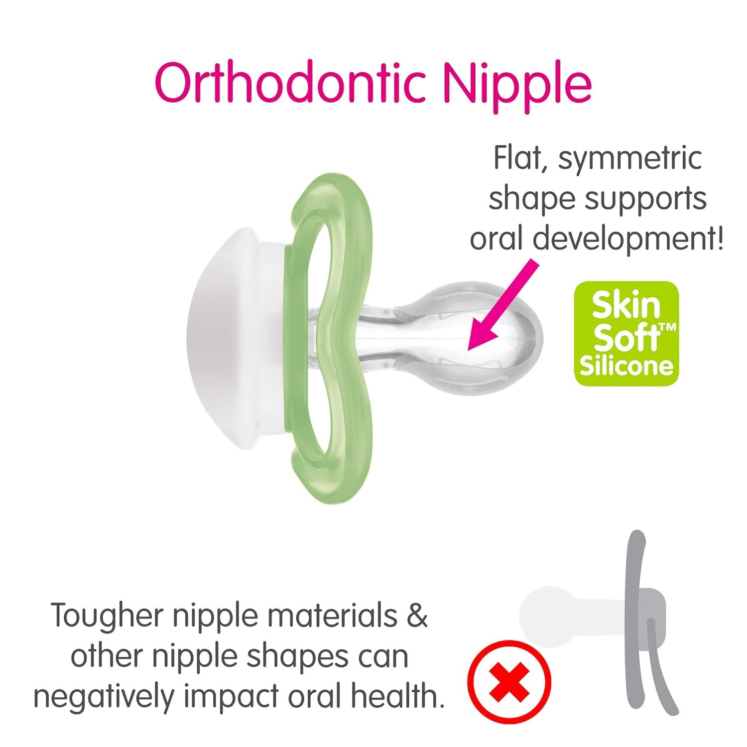 SYMMETRICAL SILICONE PACIFIER: The BPA-free silicone pacifiers for breastfed babies are made with our silky SkinSoft material and a symmetrical design that’s ideal for jaw and teeth development.
